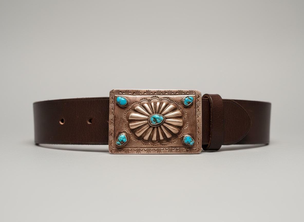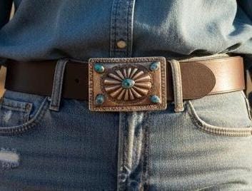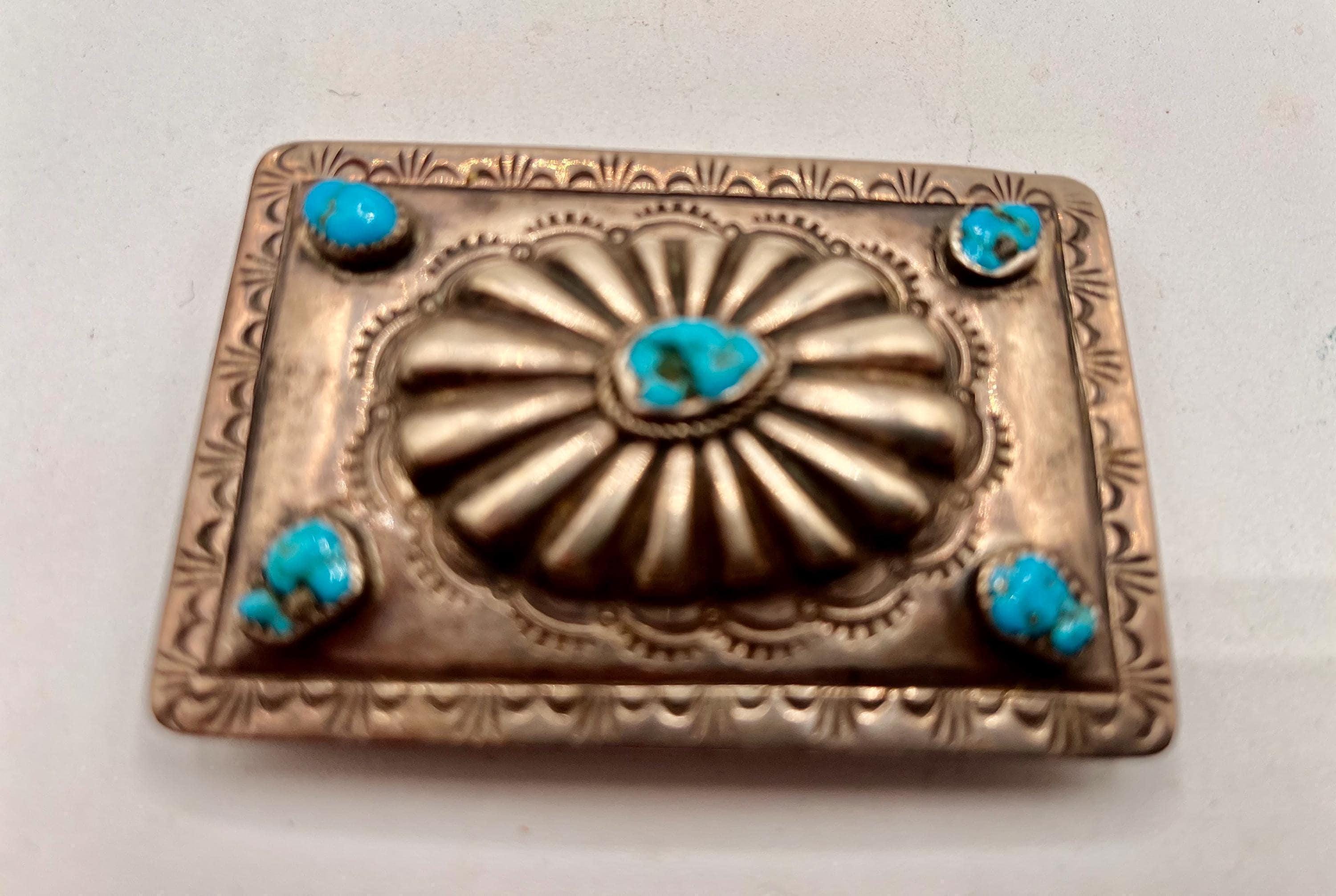 This stunning Southwestern turquoise and sterling silver belt buckle features an intricate design with a large cabochon in the center surrounded by four turquoise nuggets as well as one in the center. This piece pairs beautifully with a supple saddle leather belt available in rich British tan, dark brown, or black hues. Each buckle is a testament to decades of Southwestern artistry and meticulous handmade craftsmanship.