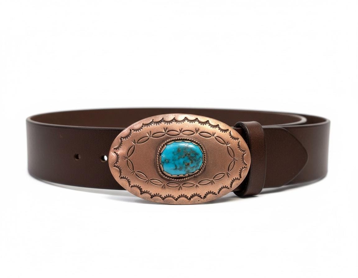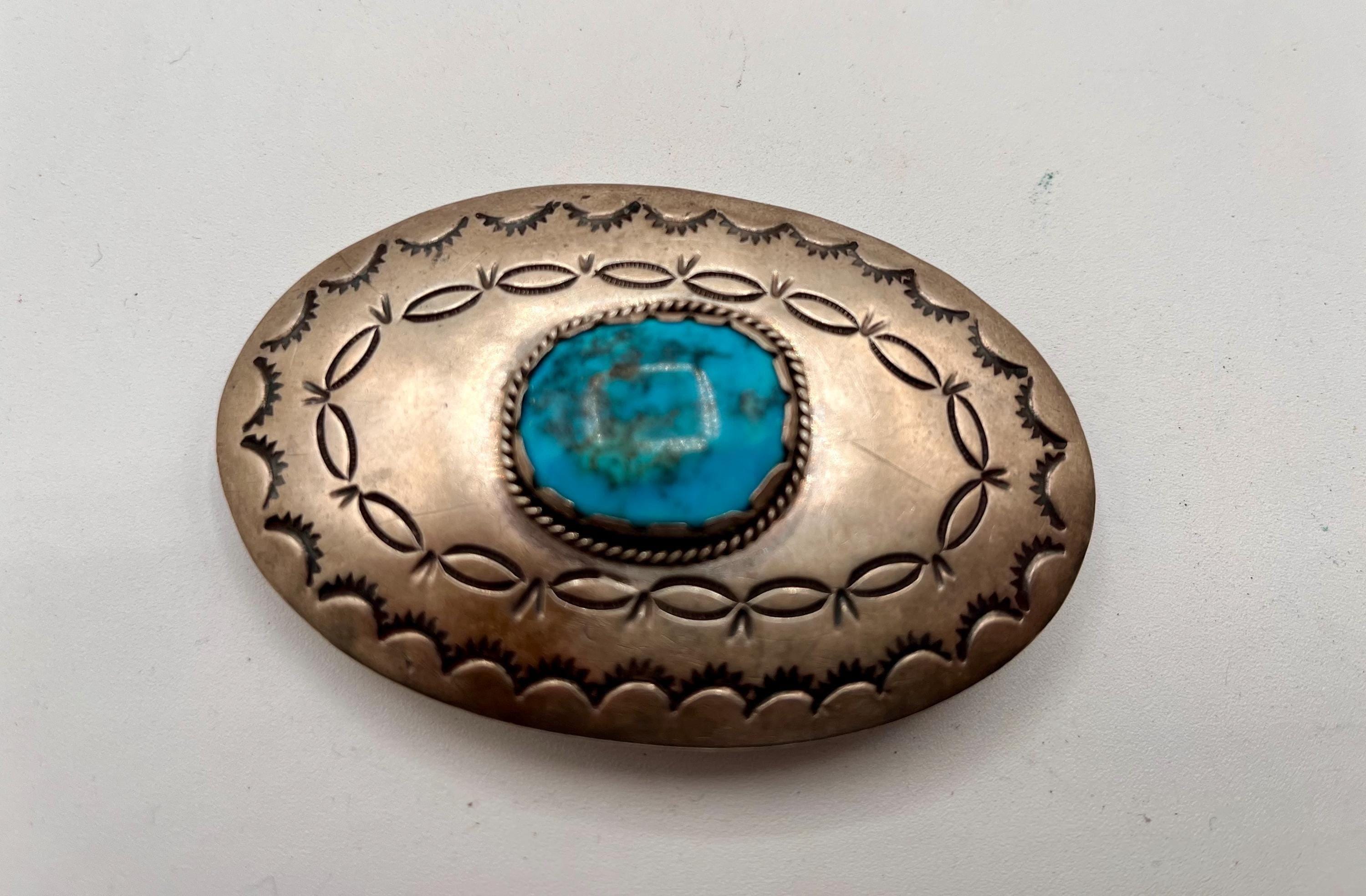 This stunning Southwestern turquoise and sterling silver belt buckle features a cabochon and intrincate design that embodies strength and heritage. This piece pairs beautifully with a supple saddle leather belt available in rich British tan, dark brown, or black hues. Each buckle is a testament to decades of Southwestern artistry and meticulous handmade craftsmanship.