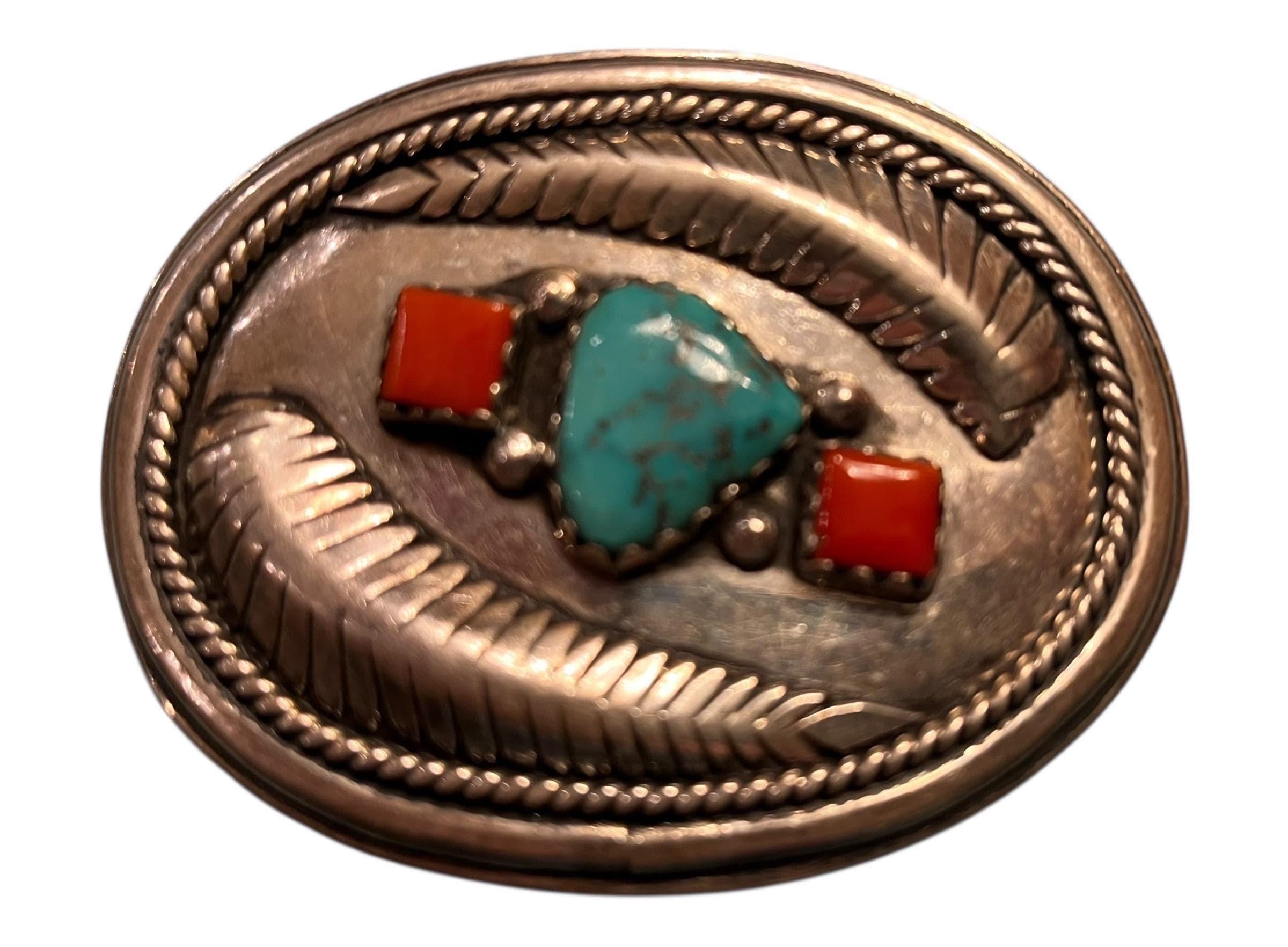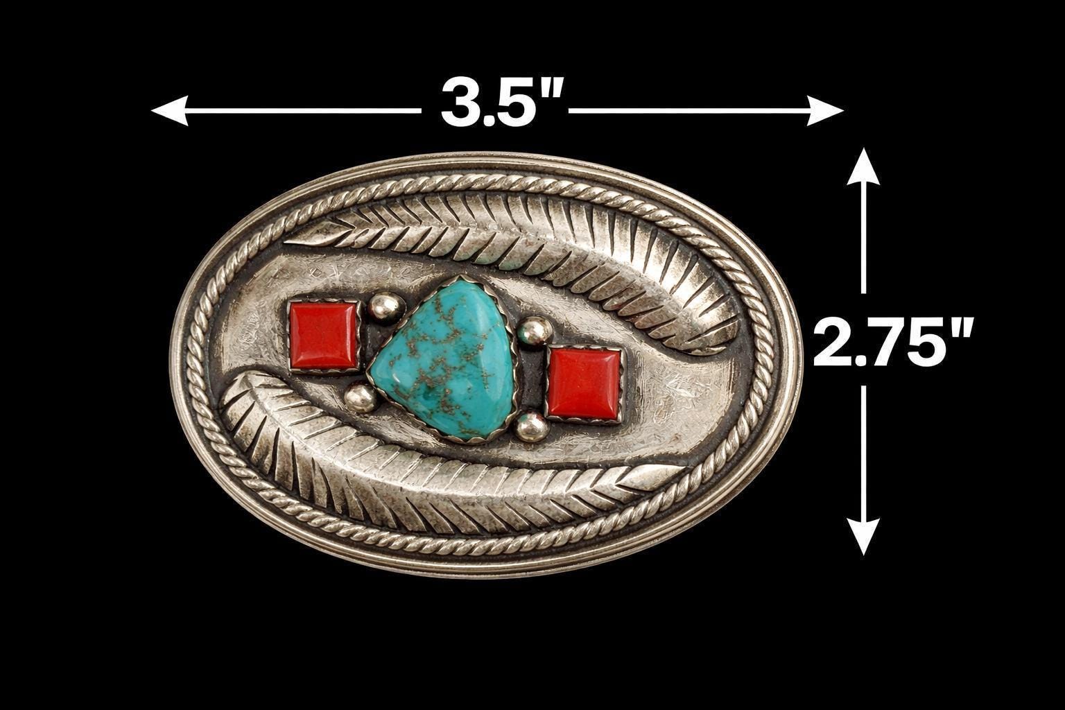 This stunning Southwestern turquoise and coral sterling silver belt buckle features a design that embodies strength and heritage with two feathers and an intricate border design. This is a very heavy, rare piece. This piece pairs beautifully with a supple saddle leather belt available in rich British tan, dark brown, or black hues. Each buckle is a testament to decades of Southwestern artistry and meticulous handmade craftsmanship.
