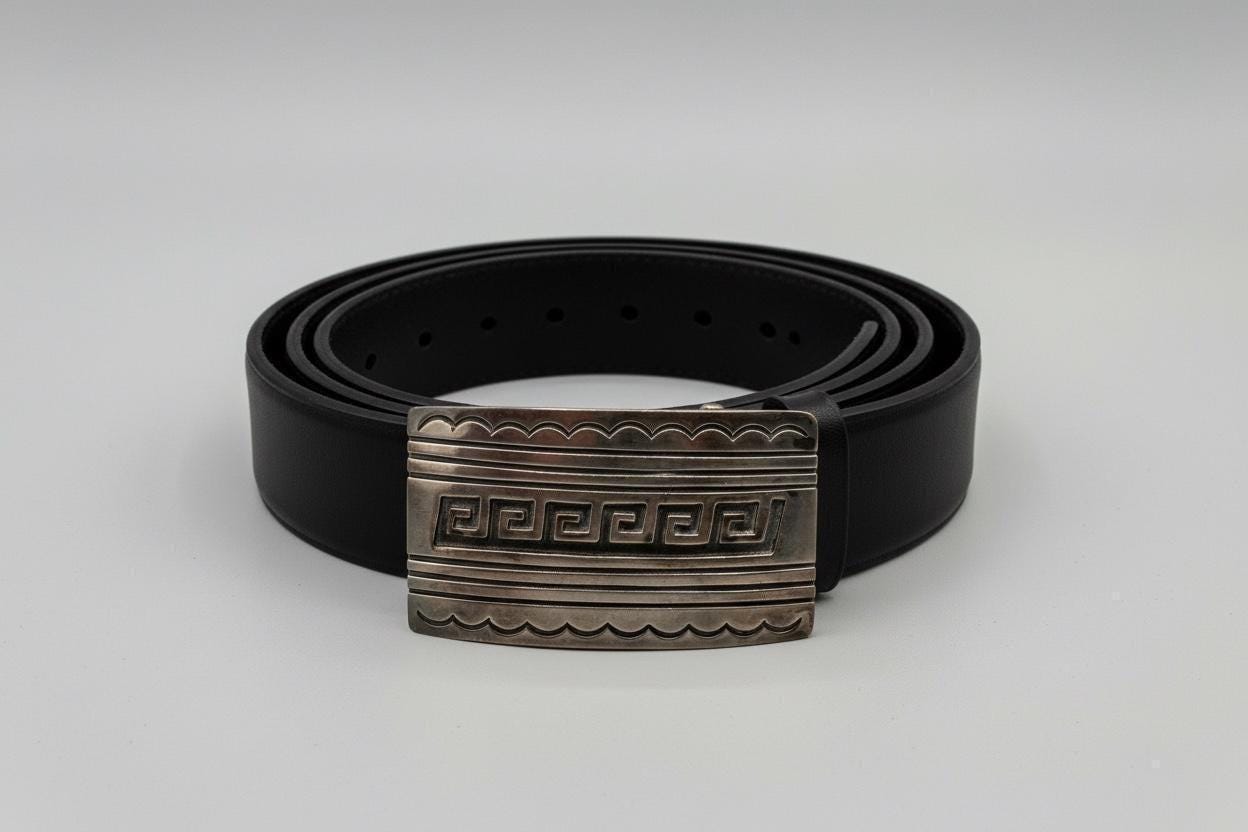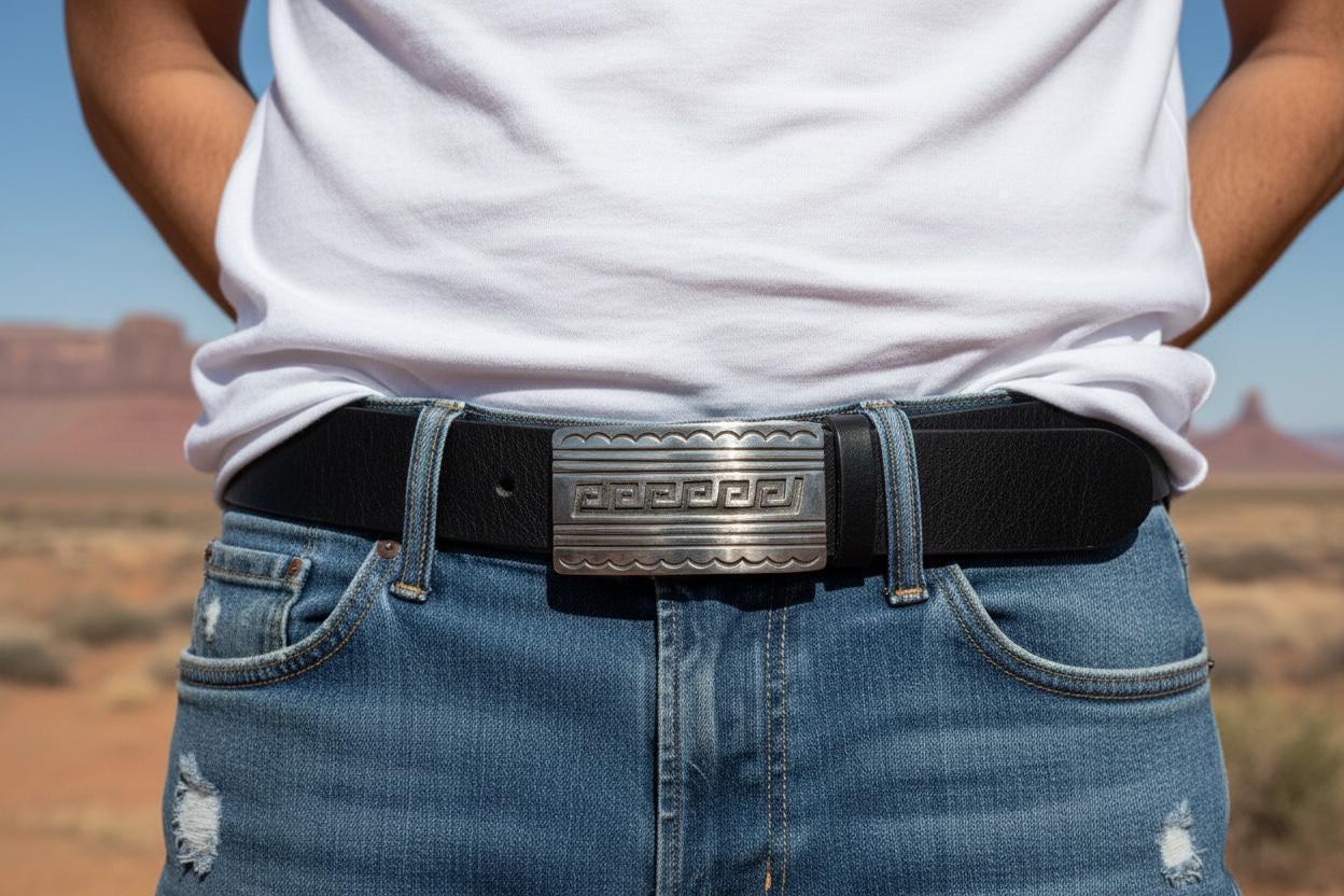 This stunning Southwestern sterling silver belt buckle pairs beautifully with a supple saddle leather belt available in rich British tan, dark brown, or black hues. Each buckle is a testament to decades of Southwestern artistry and meticulous handmade craftsmanship.