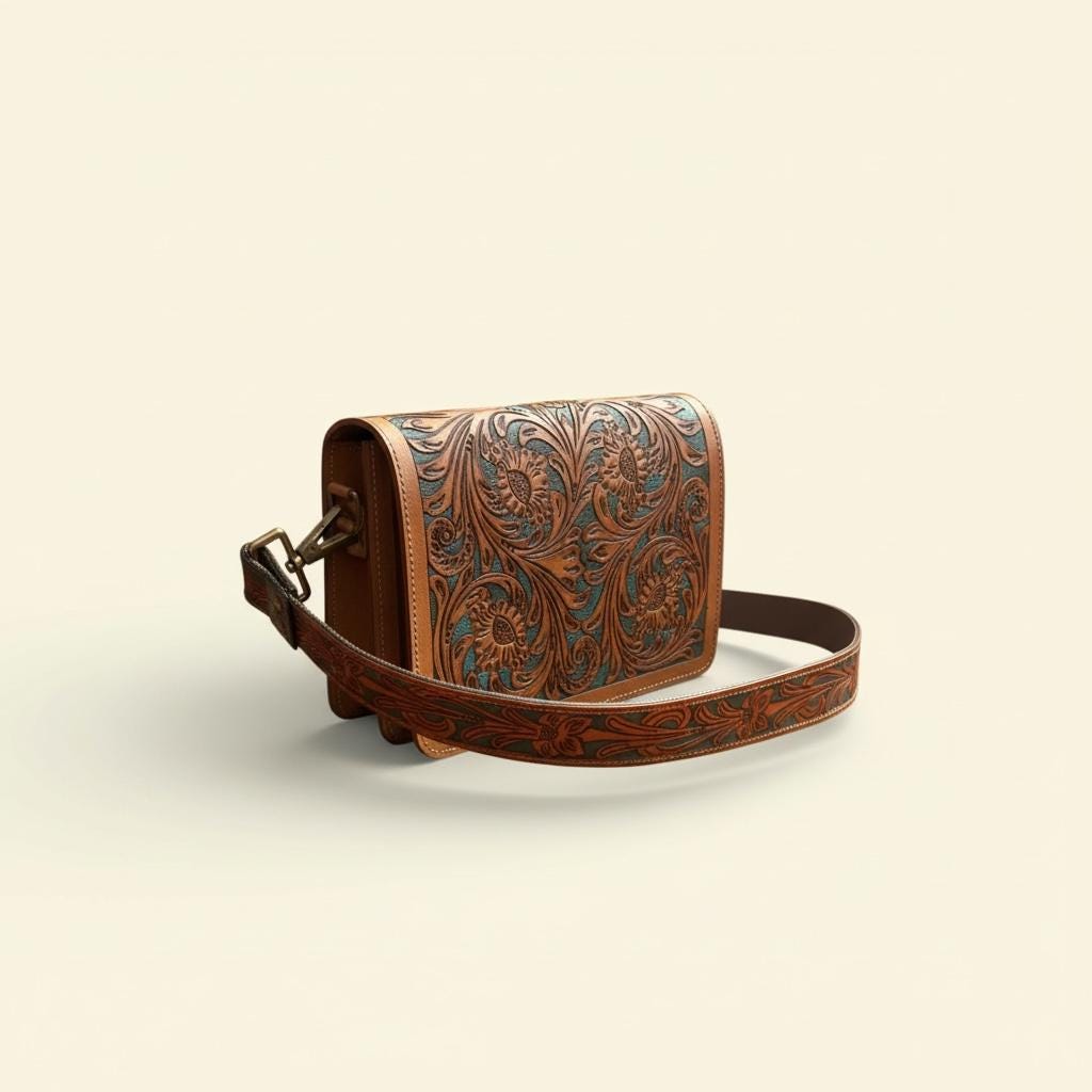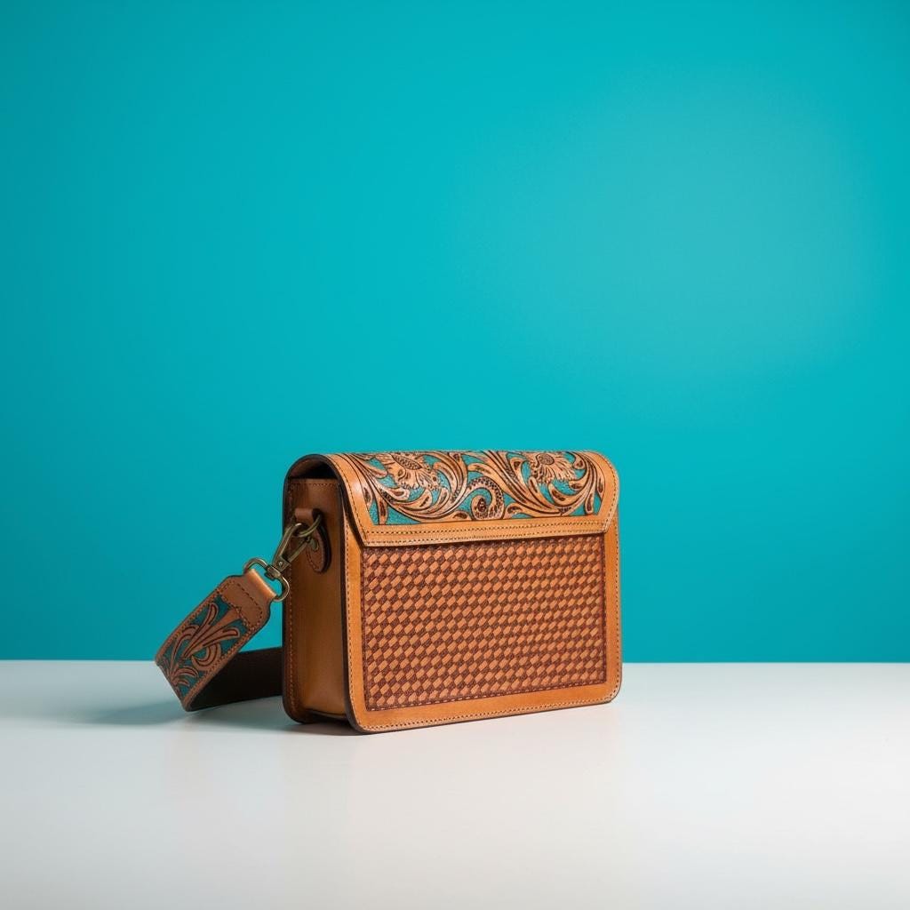 Inspired by the rich heritage of the Southwest, this hand carved leather crossbody bag showcases exquisite artisan craftsmanship and timeless style. Each bag is meticulously tooled by our expert craftsman, taking up to a week to complete, resulting in a truly heirloom quality bag. Perfect for those seeking a unique aqua turquoise bag that combines beauty with practicality.