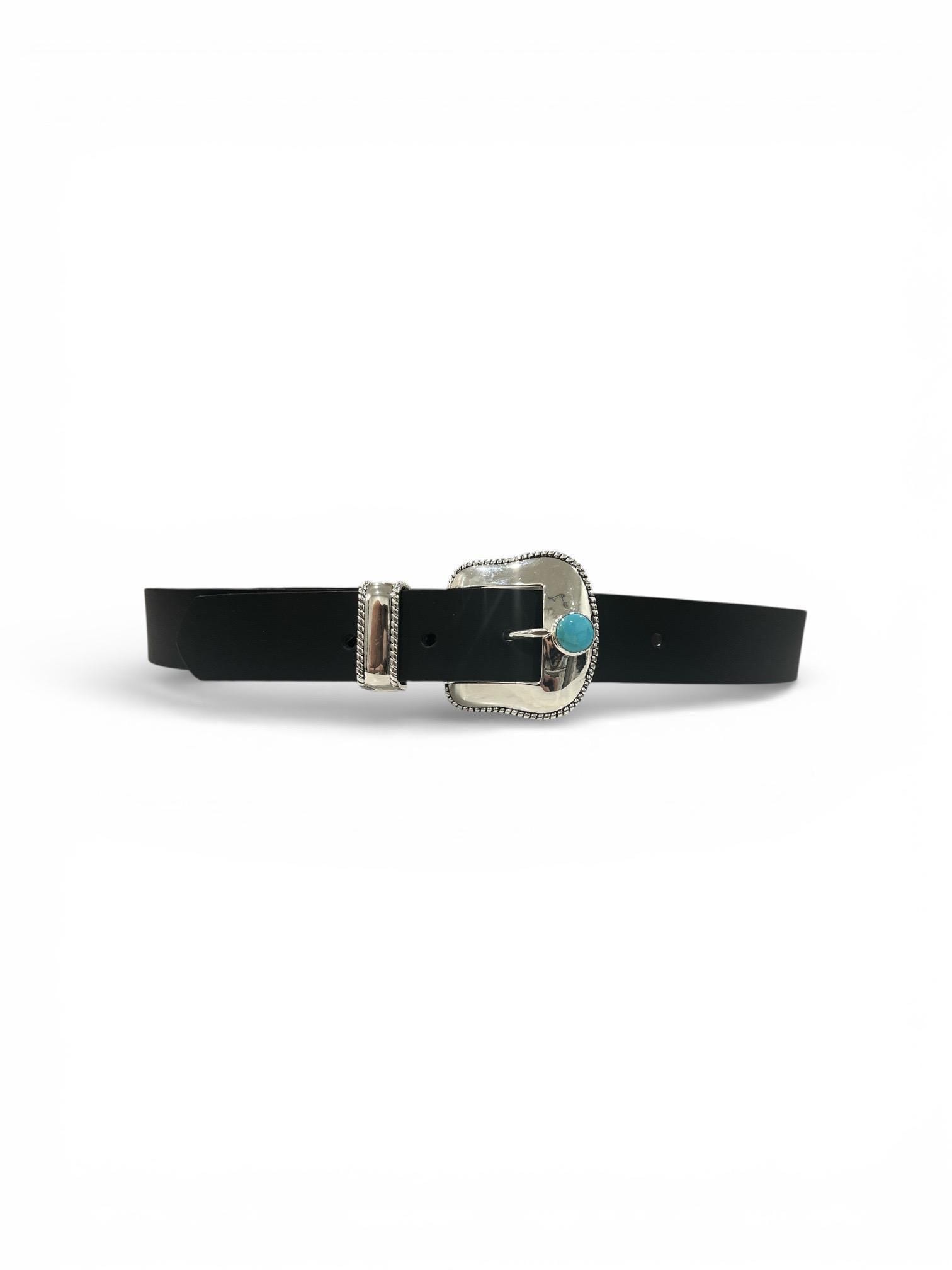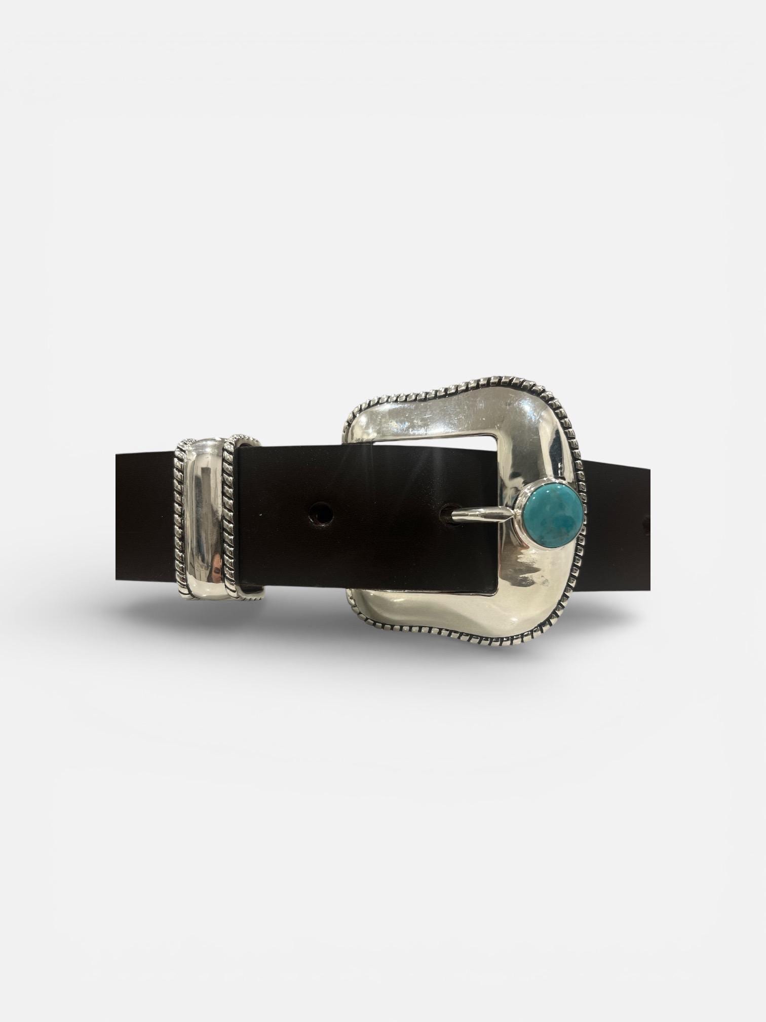 Elevate your western and southwestern wardrobe with this genuine turquoise and sterling silver belt buckle paired with a handcrafted full-grain leather belt, made in the USA.