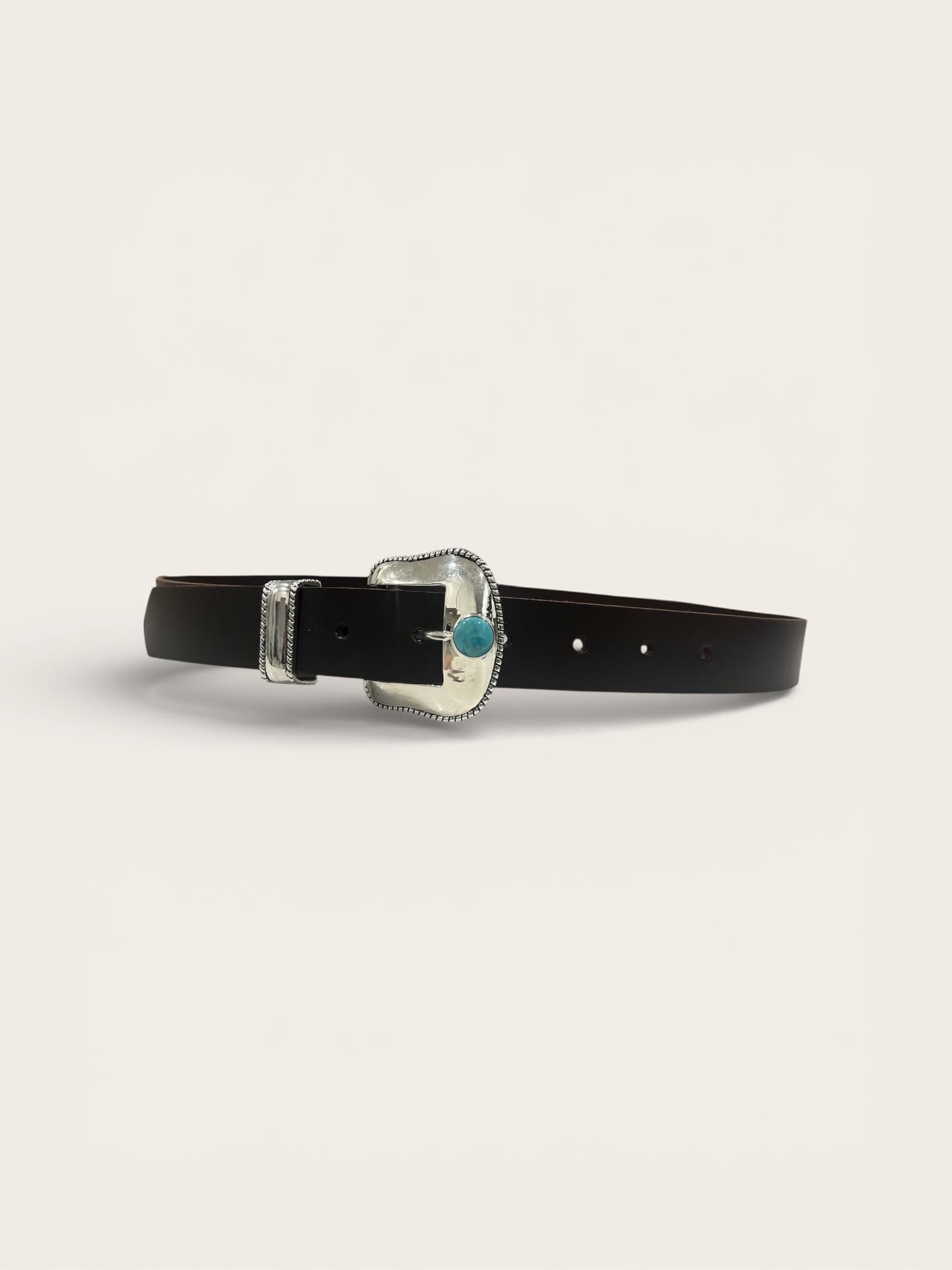 This timeless buckle features natural turquoise set in solid sterling silver, creating a striking statement piece rooted in Southwestern heritage and craftsmanship. Each buckle is paired with our custom-made leather belt, cut and finished by hand for durability, comfort, and heirloom quality.