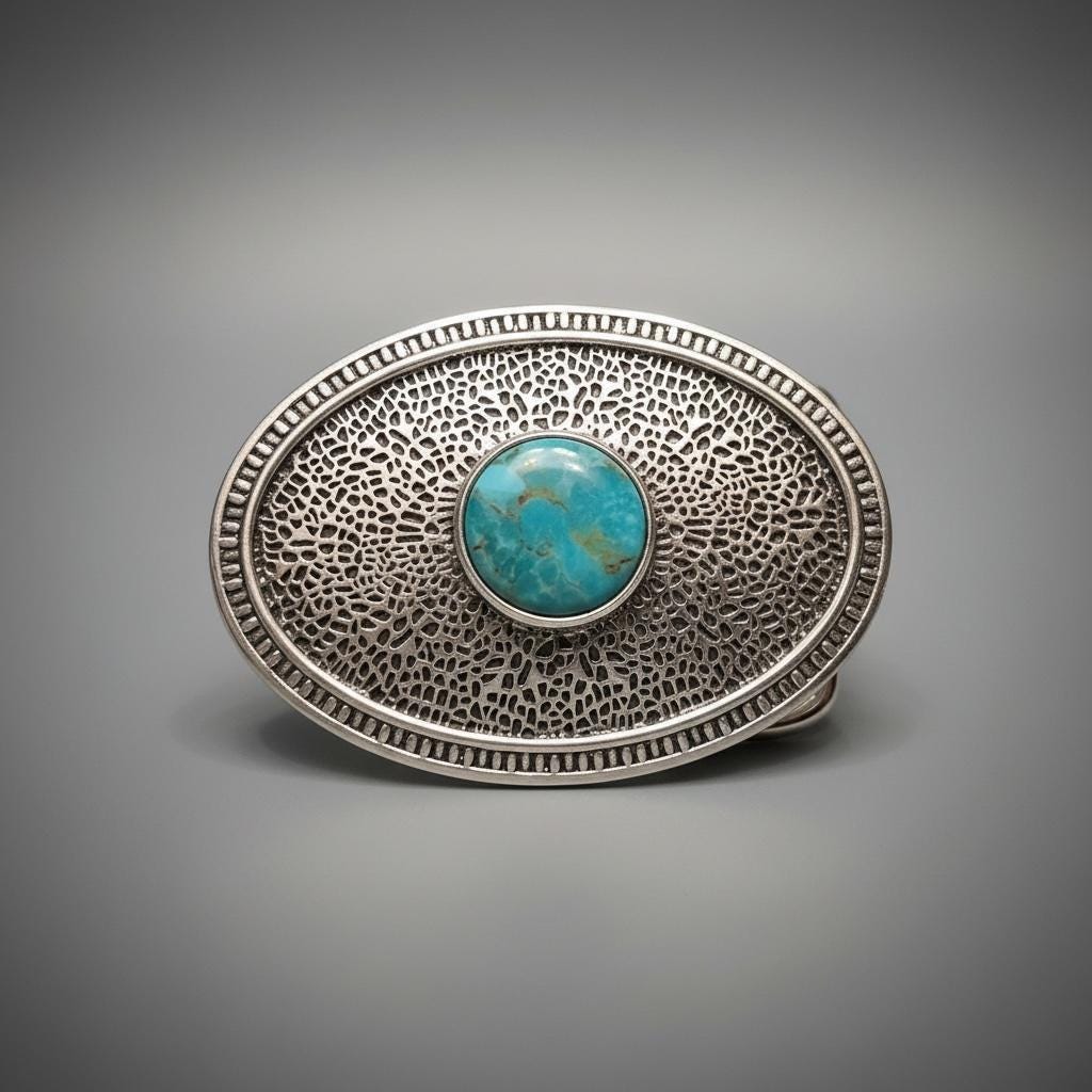 This timeless buckle features natural turquoise set in solid sterling silver, creating a striking statement piece rooted in Southwestern heritage and craftsmanship. Each buckle is paired with our custom-made leather belt, cut and finished by hand for durability, comfort, and heirloom quality.