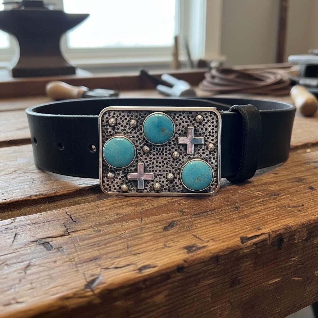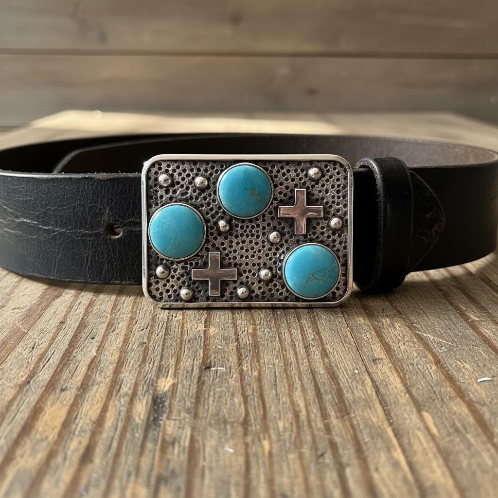 This timeless buckle features natural turquoise set in solid sterling silver, creating a striking statement piece rooted in Southwestern heritage and craftsmanship. Each buckle is paired with our custom-made leather belt, cut and finished by hand for durability, comfort, and heirloom quality.