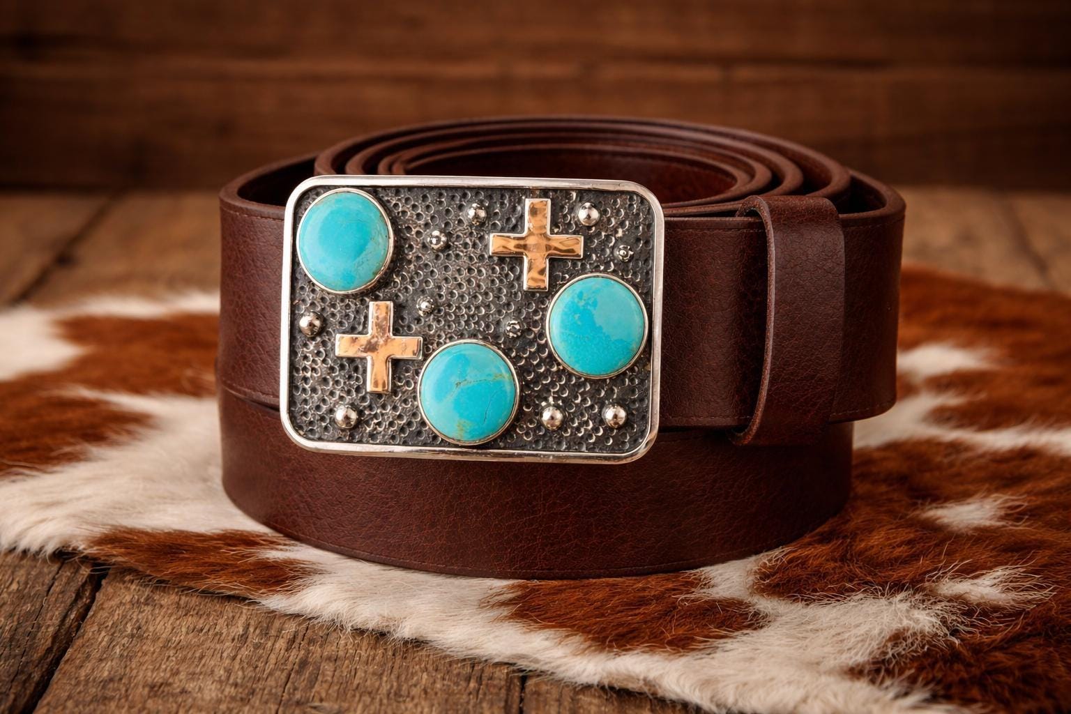 Elevate your western and southwestern wardrobe with this genuine turquoise and sterling silver belt buckle paired with a handcrafted full-grain leather belt, made in the USA.