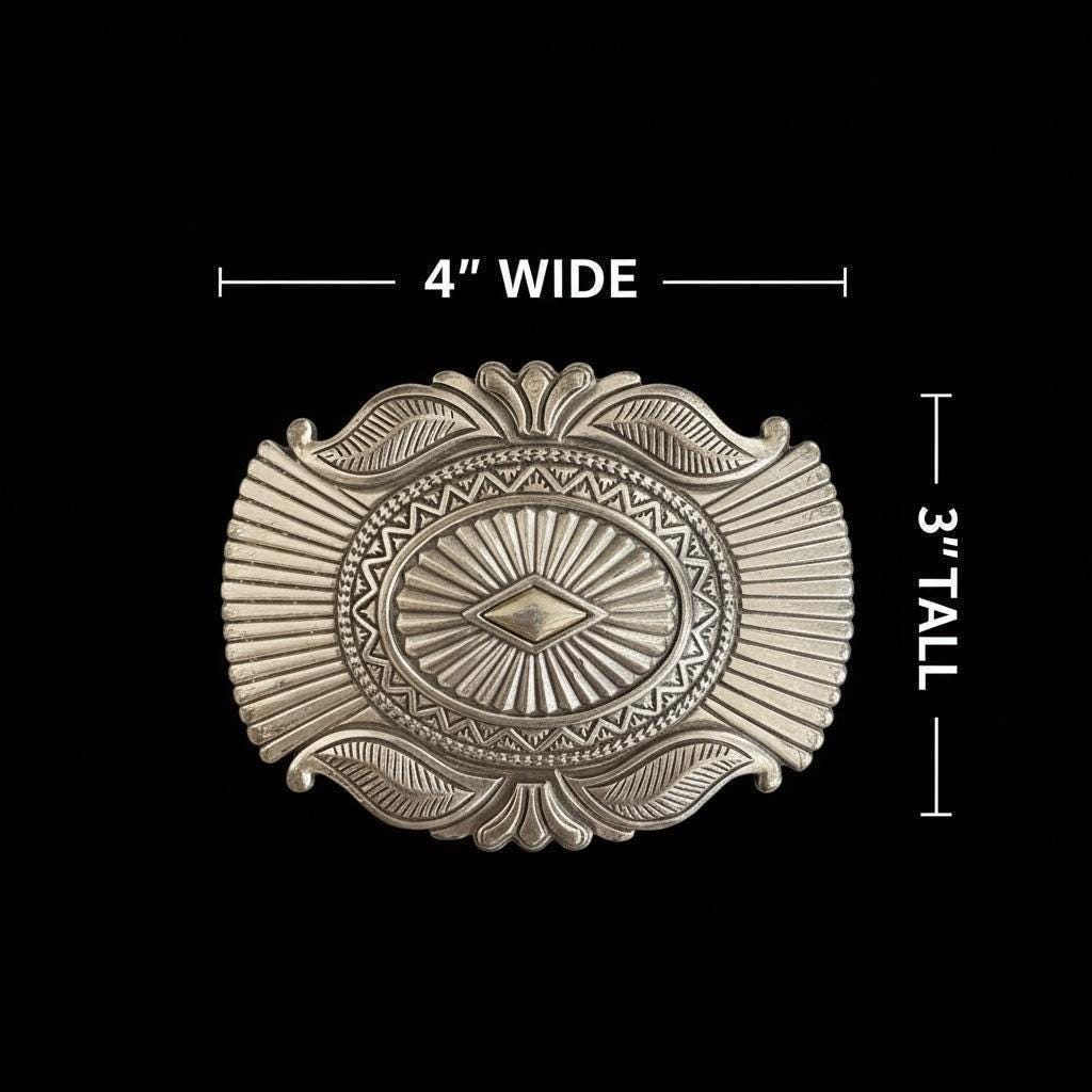 Buckle measures 4” wide by 3” tall and fits up to a 1.5 belt