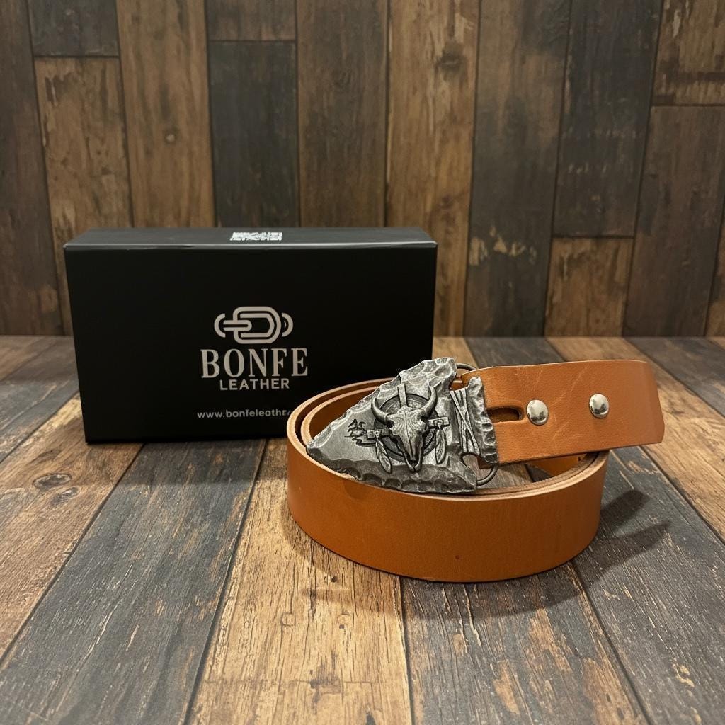 Authentic vintage Southwestern arrowhead belt buckle featuring a detailed buffalo skull with feather and cross accents and a rugged antiqued metal finish. A bold Western statement piece with collectible appeal.