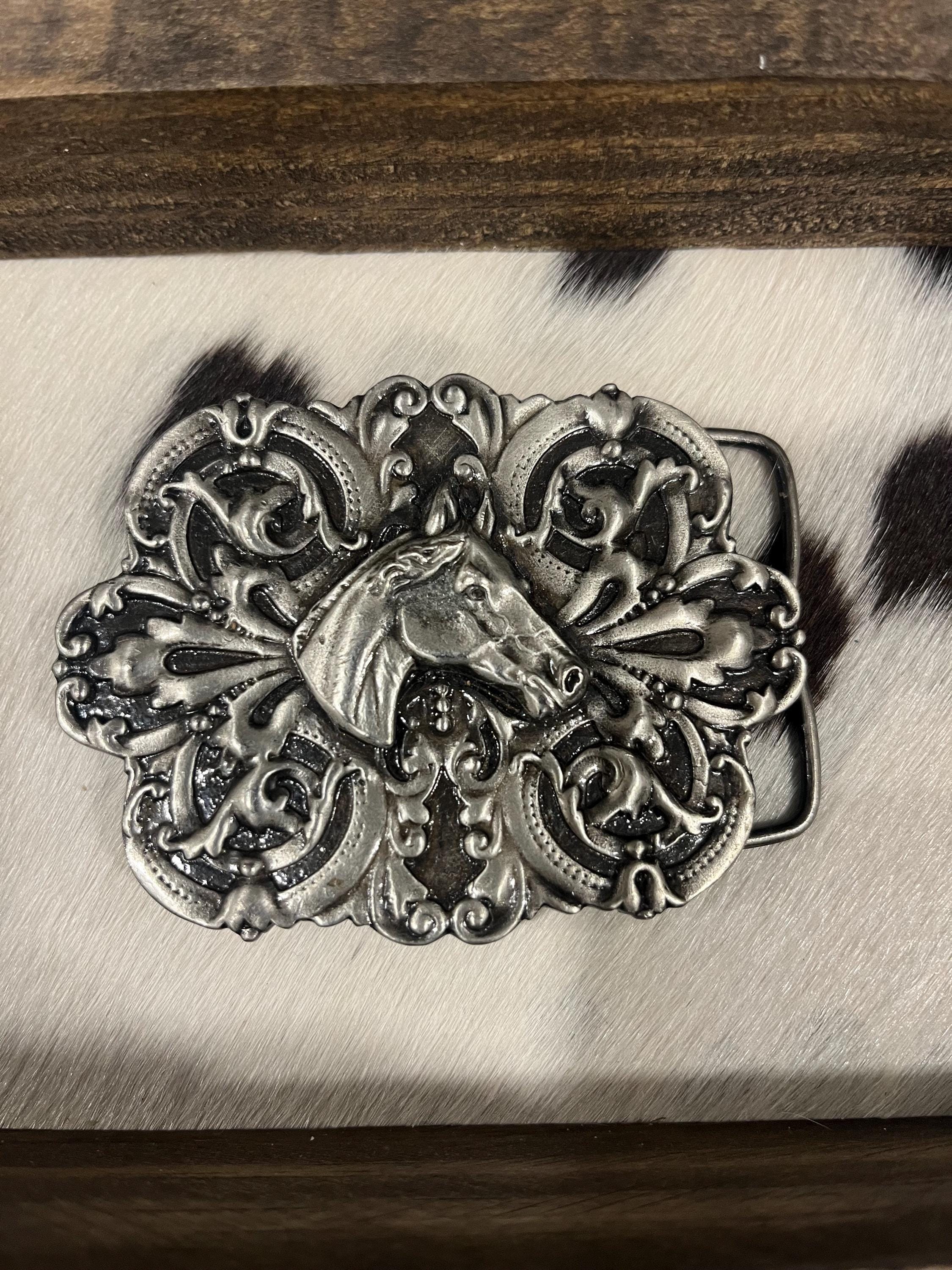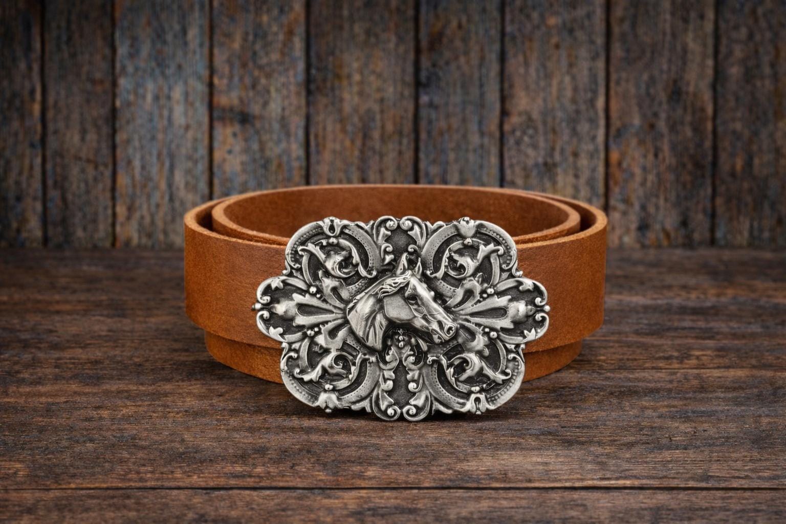 Discover a handcrafted leather belt and buckle depicting a horse with an intricate design. If you're searching for a western style statement, this belt offers both style and lasting quality for any cowgirl or horse lover.