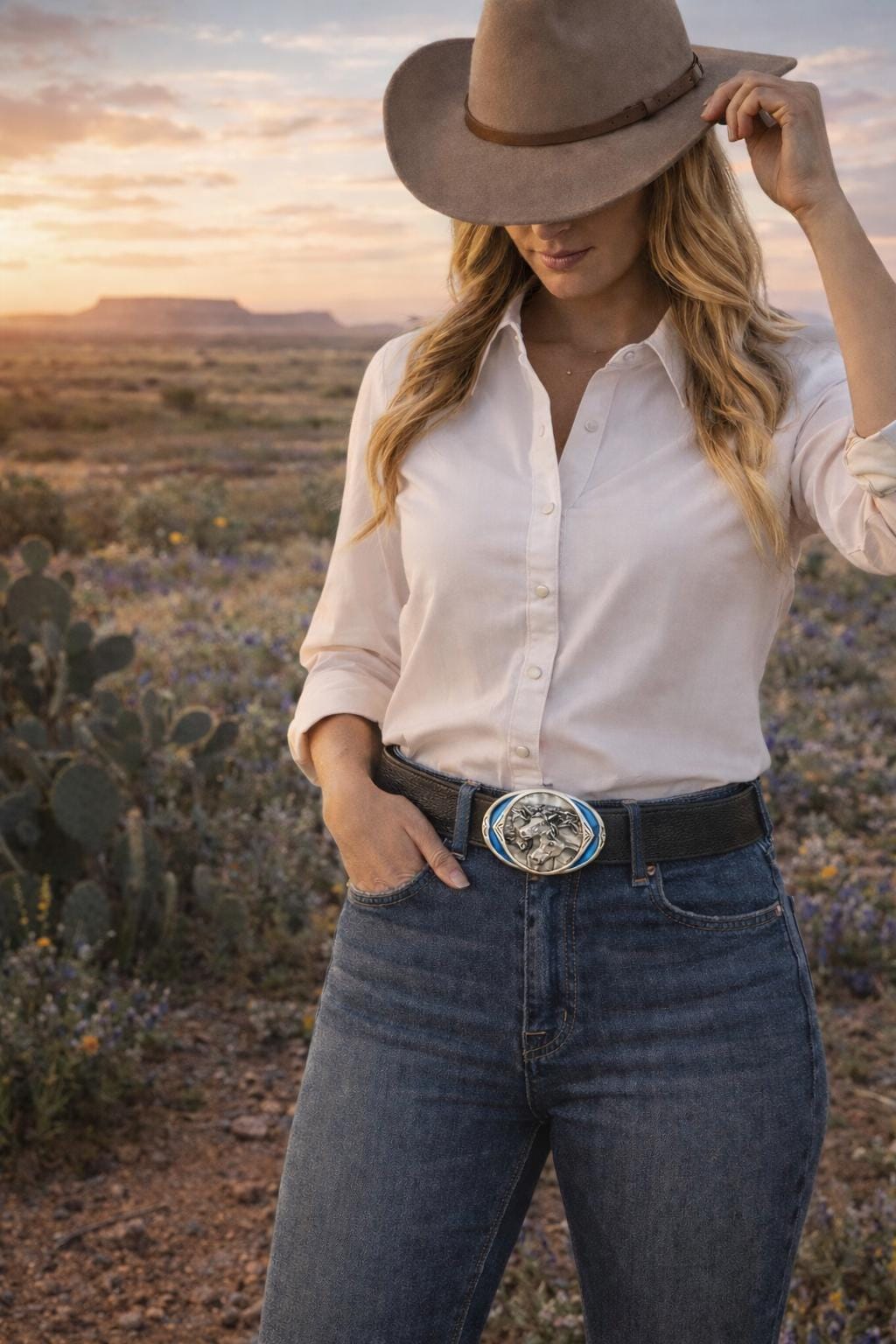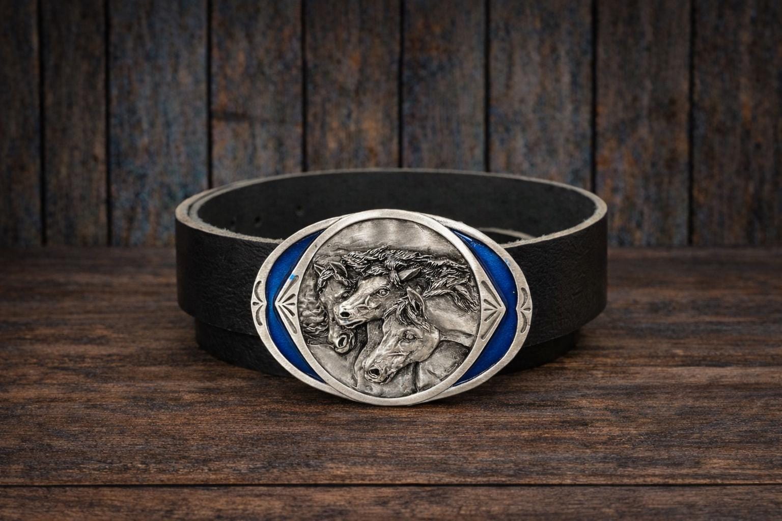 Discover a handcrafted leather belt and buckle depicting a horse with an intricate inlay design. If you're searching for a western style statement, this belt offers both style and lasting quality for any cowgirl or horse lover.