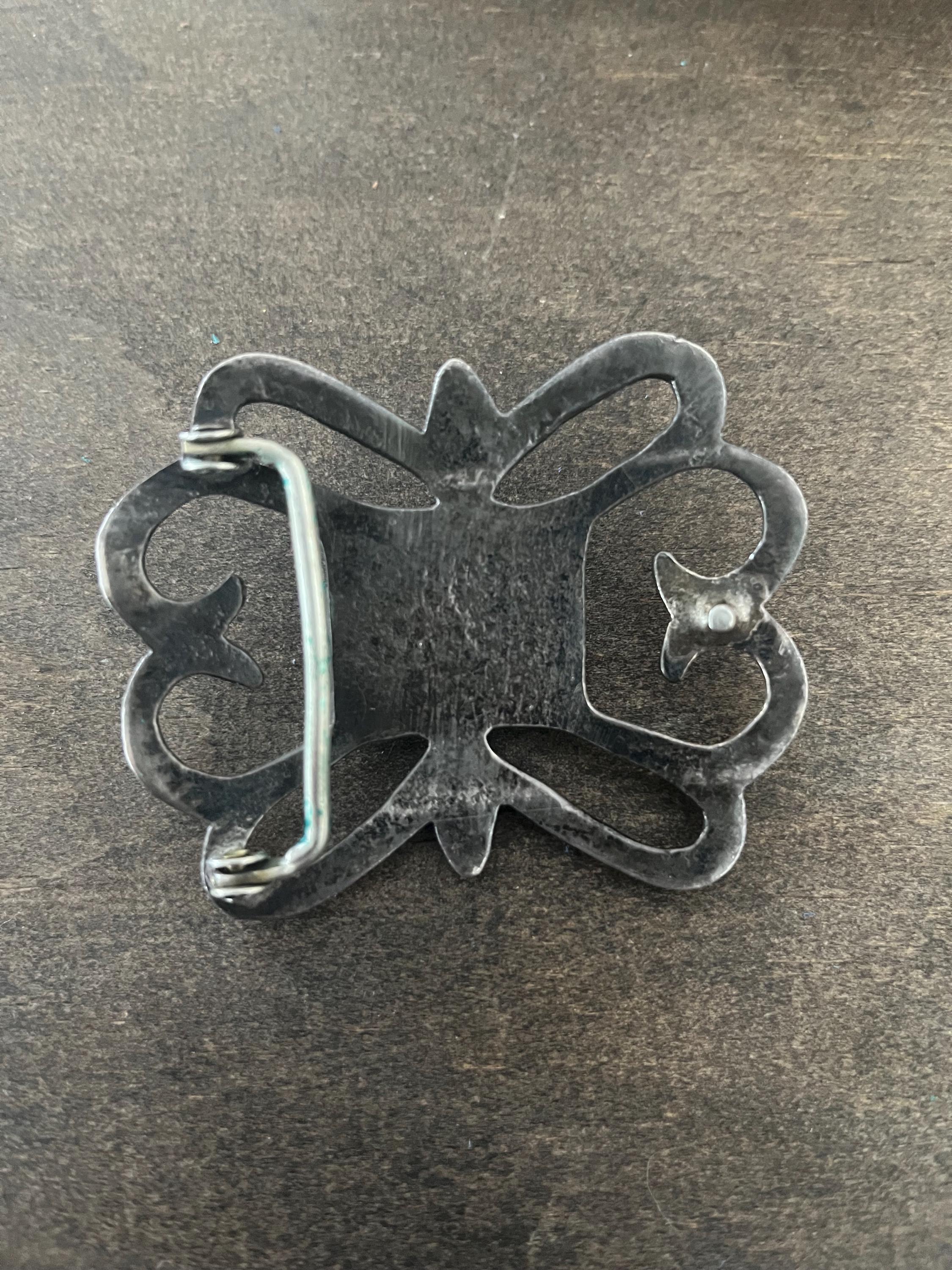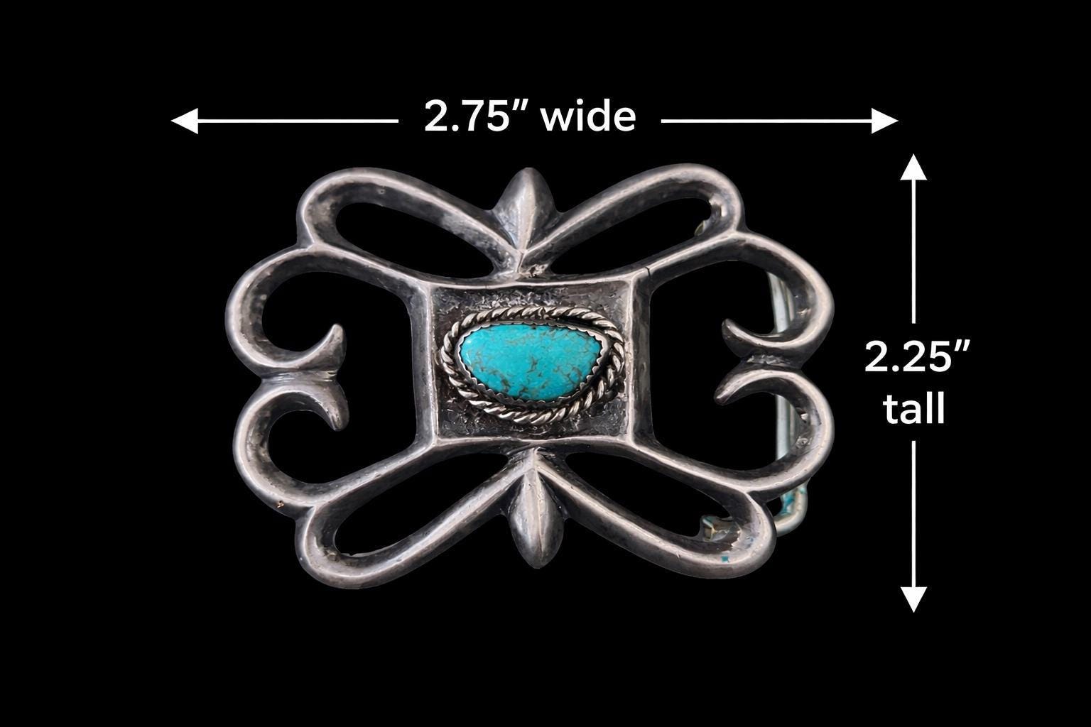 This stunning Southwestern turquoise and sterling silver belt buckle features a design made via sand cast technique. This piece pairs beautifully with a supple saddle leather belt available in rich British tan, dark brown, or black hues. Each buckle is a testament to decades of Southwestern artistry and meticulous handmade craftsmanship.