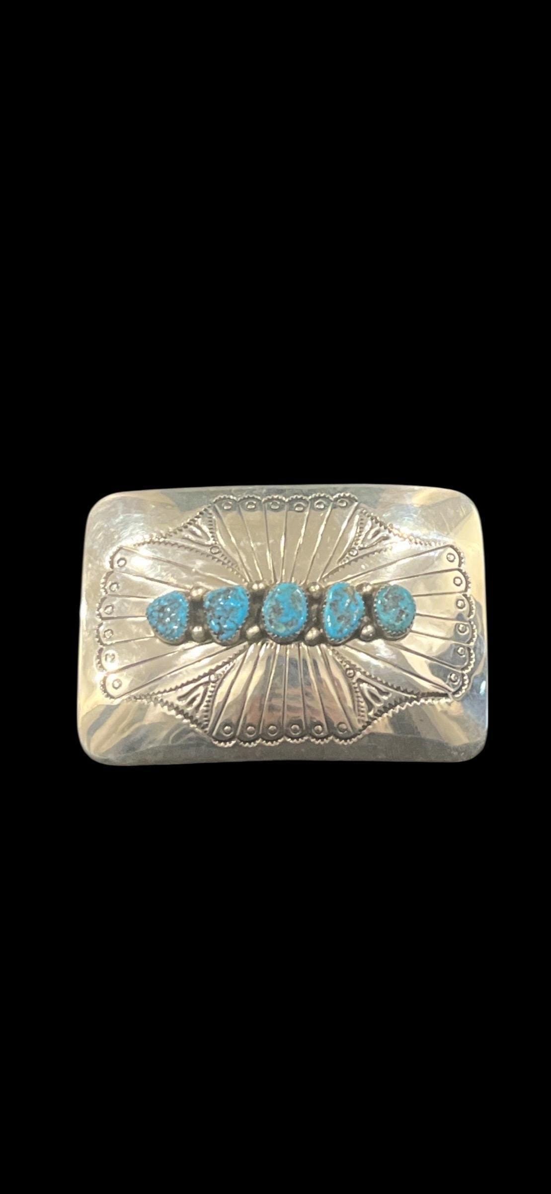 This vintage Native American sterling silver turquoise belt buckle, signed “JB,” is paired with a handcrafted full-grain leather belt made in the USA. Featuring five natural turquoise stones set in a traditional Southwestern design, this buckle showcases classic Native American silversmithing and timeless craftsmanship.