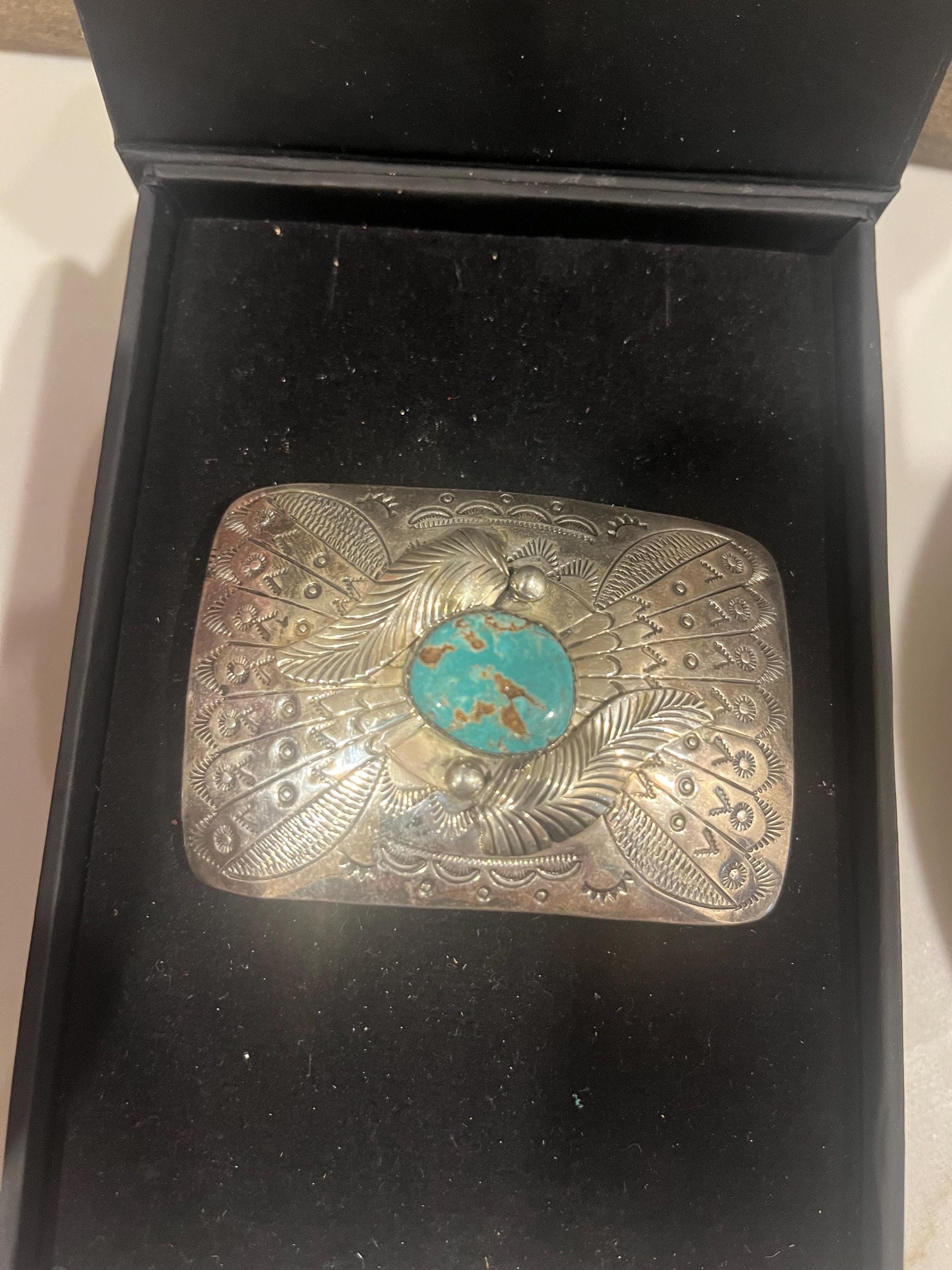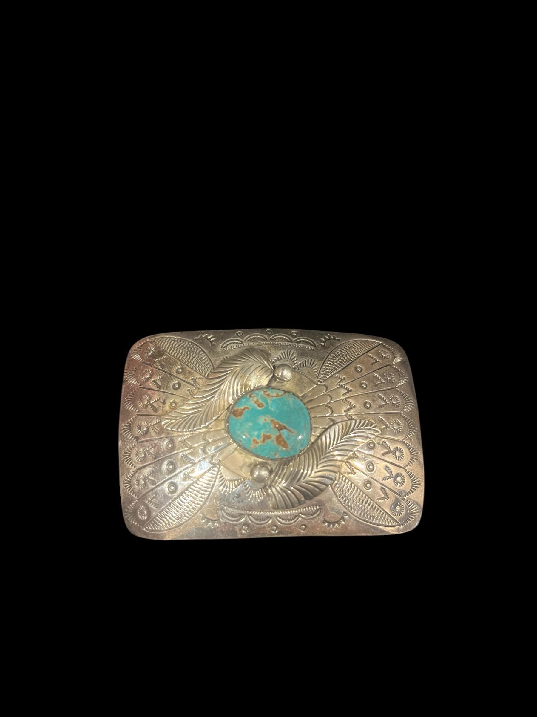 This stunning Southwestern turquoise sterling silver belt buckle features an intricate design that embodies strength and heritage with a turquoise nugget in the center. This piece pairs beautifully with a supple saddle leather belt available in rich British tan, dark brown, or black hues. Each buckle is a testament to decades of Southwestern artistry and meticulous handmade craftsmanship.
