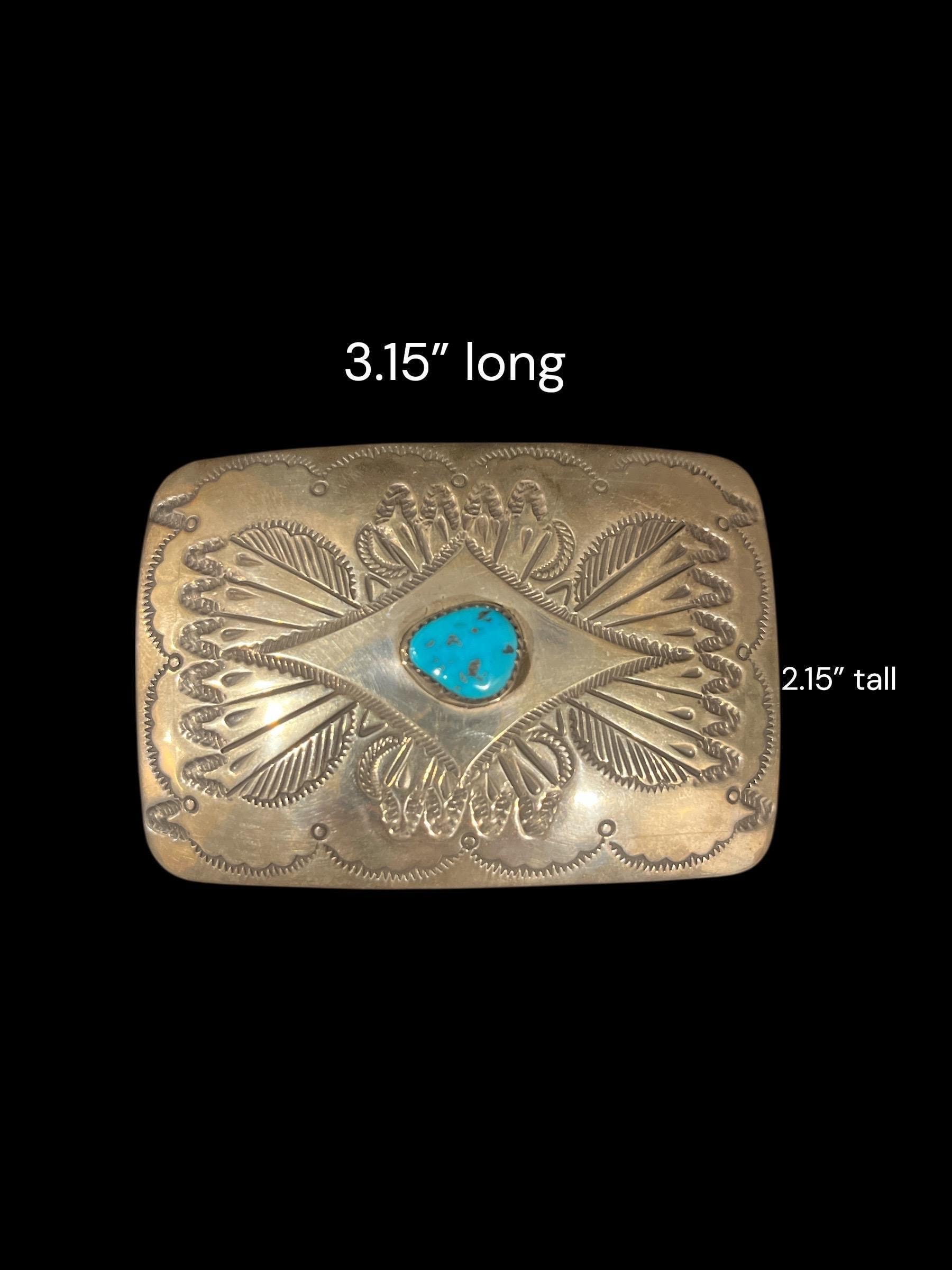 This stunning Southwestern turquoise sterling silver belt buckle features an intricate design that embodies strength and heritage with a turquoise nugget in the center. This piece pairs beautifully with a supple saddle leather belt available in rich British tan, dark brown, or black hues. Each buckle is a testament to decades of Southwestern artistry and meticulous handmade craftsmanship.