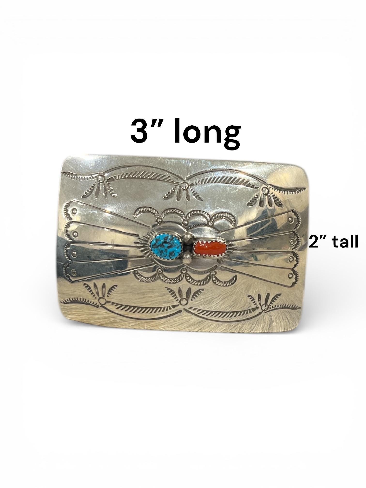 This stunning Southwestern turquoise and coral sterling silver belt buckle features an intricate design that embodies strength and heritage with a turquoise nugget in the center. This piece pairs beautifully with a supple saddle leather belt available in rich British tan, dark brown, or black hues. Each buckle is a testament to decades of Southwestern artistry and meticulous handmade craftsmanship.