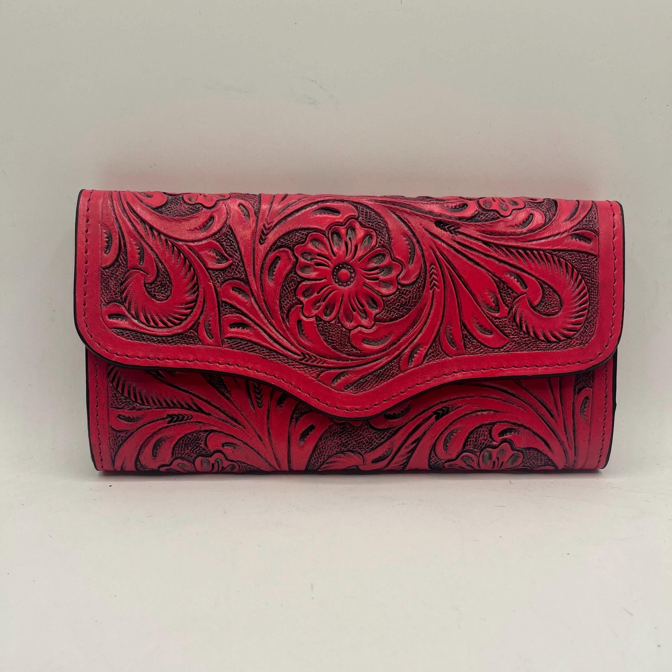 The vibrant red finish highlights every carved detail while the sleek silhouette keeps it elegant and versatile. Perfect as a clutch purse, wallet, or statement accessory for concerts, nights out, festivals, rodeos, or everyday elevated western style.