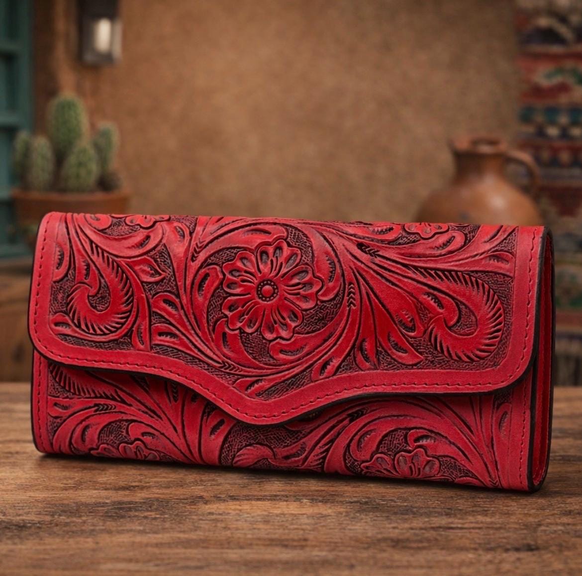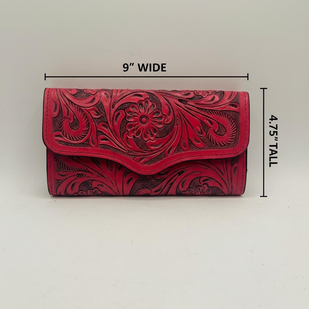 Make a bold statement with this stunning handcarved genuine leather clutch in bold western red with black undertones, crafted for lovers of artisan detail and timeless western style. This piece features intricate floral tooling carved directly into premium leather, creating a rich texture and depth that makes each clutch completely unique.