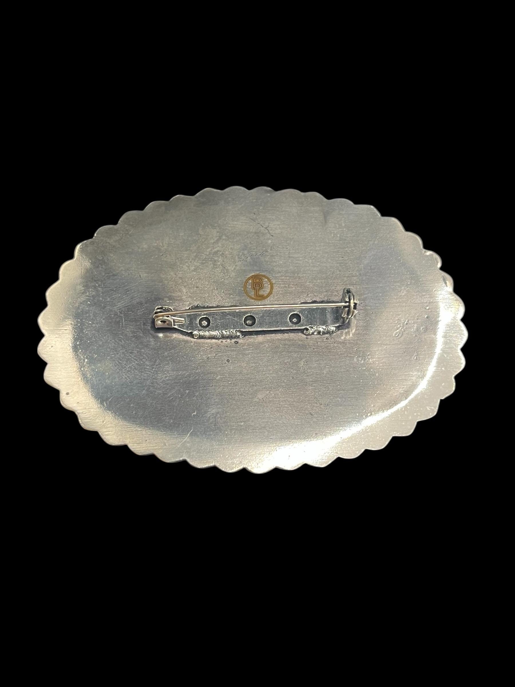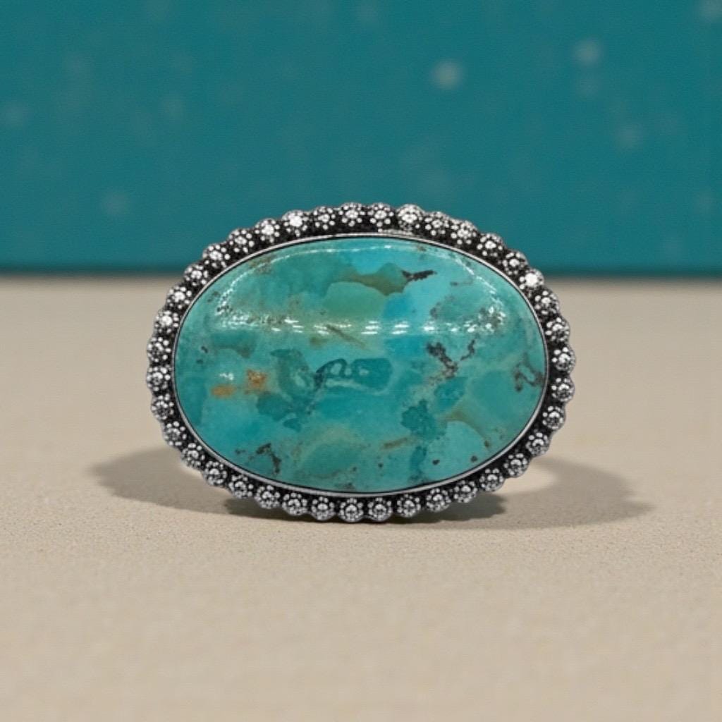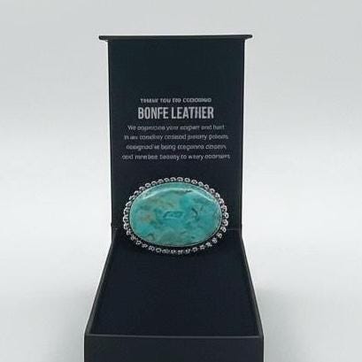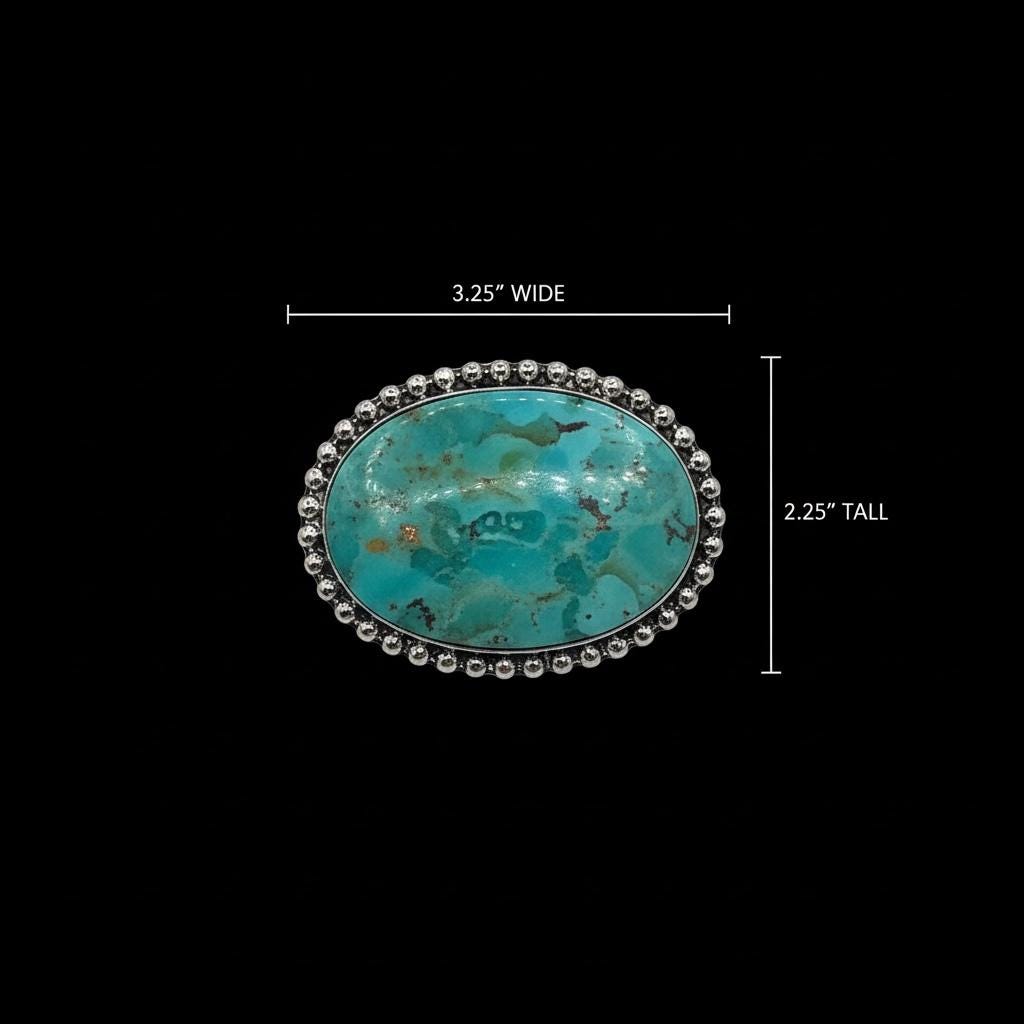 Make a bold statement with this stunning Kingman turquoise brooch pin, featuring a natural turquoise stone set in white brass. This oversized statement piece blends classic western charm with elevated fashion styling.