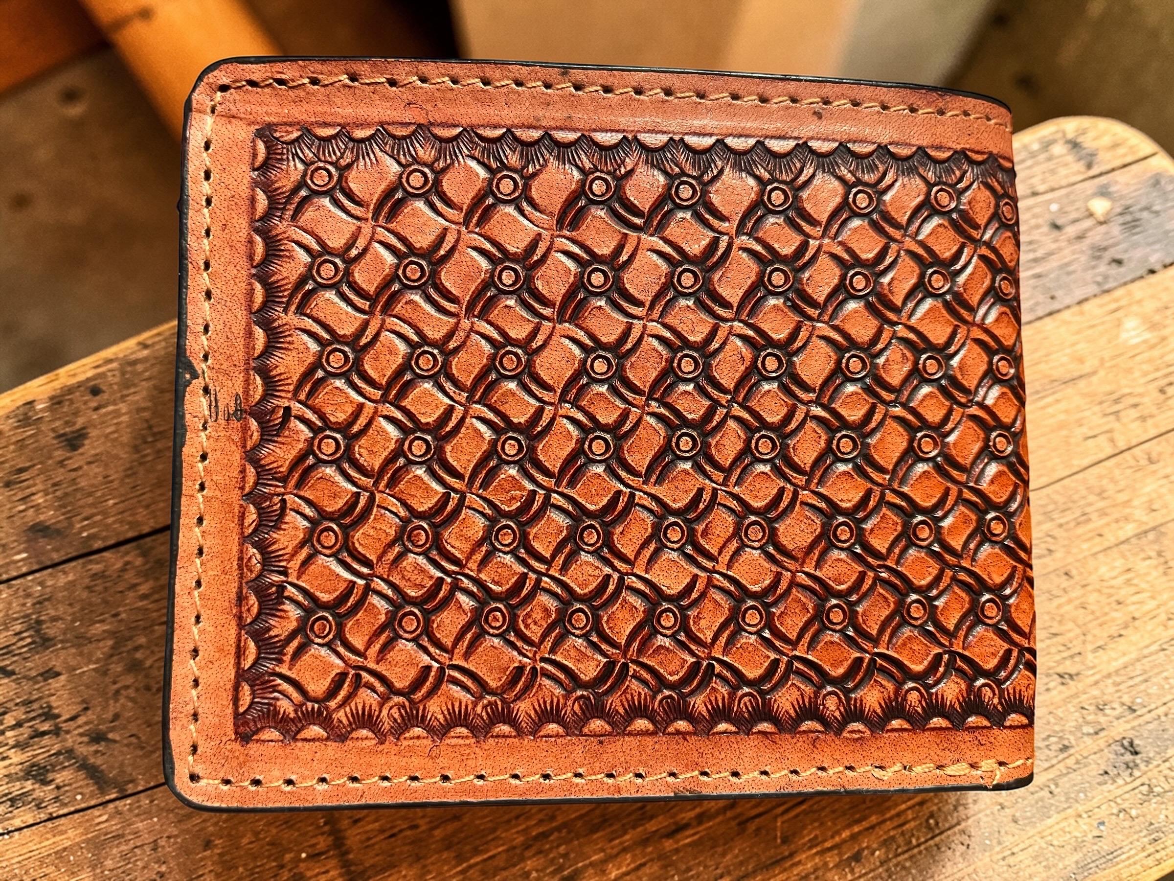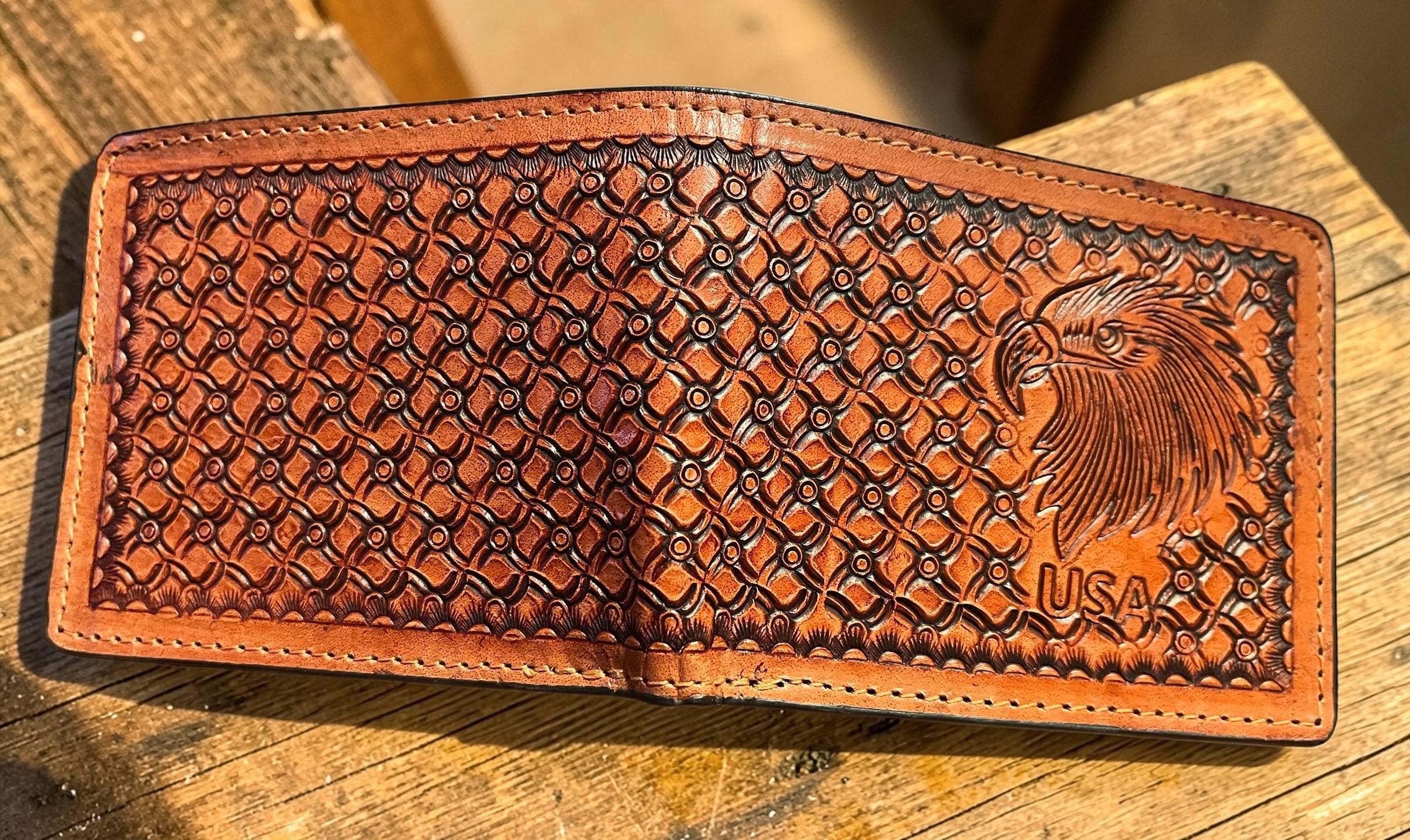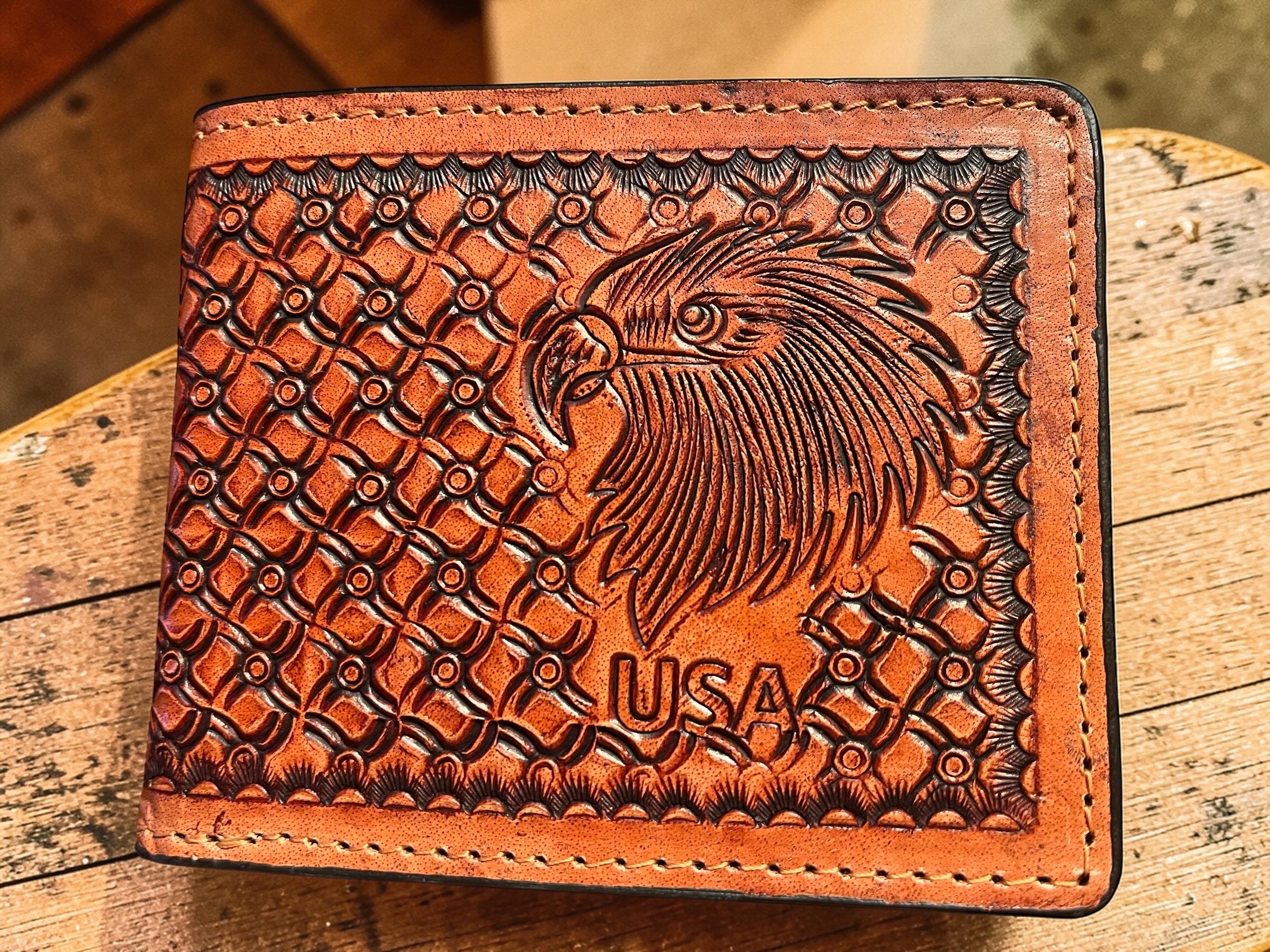 Make a bold statement with this handcrafted genuine leather bifold wallet featuring a striking US Eagle design and detailed basket weave tooling. Each wallet is carefully hand tooled, dyed in a rich British tan finish, and stitched for durability, making it both a functional everyday carry and a collectible artisan piece.