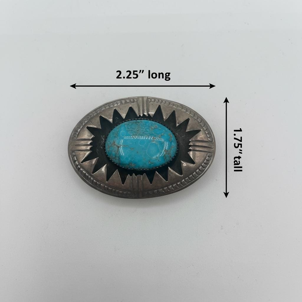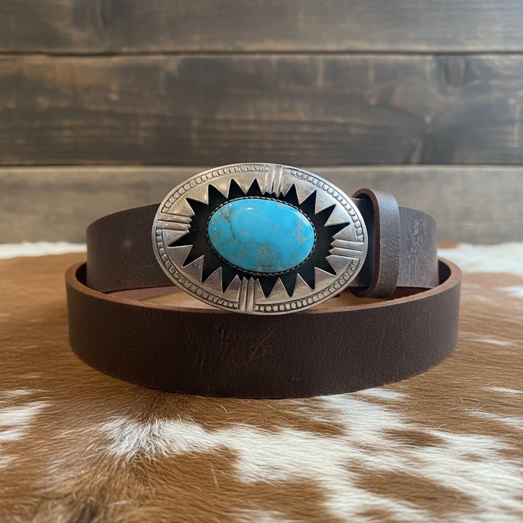 This vintage Native American sterling silver turquoise belt buckle, signed “SB,” is paired with a handcrafted full-grain leather belt made in the USA. Featuring a natural turquoise stone set within a traditional hand-stamped Southwestern design, this buckle represents authentic Native American silversmithing and timeless craftsmanship.