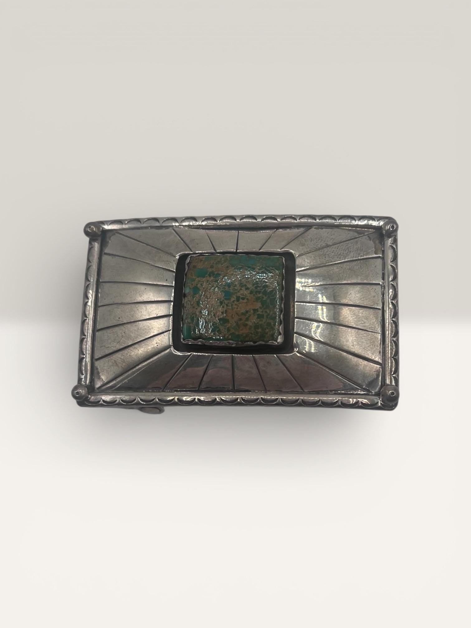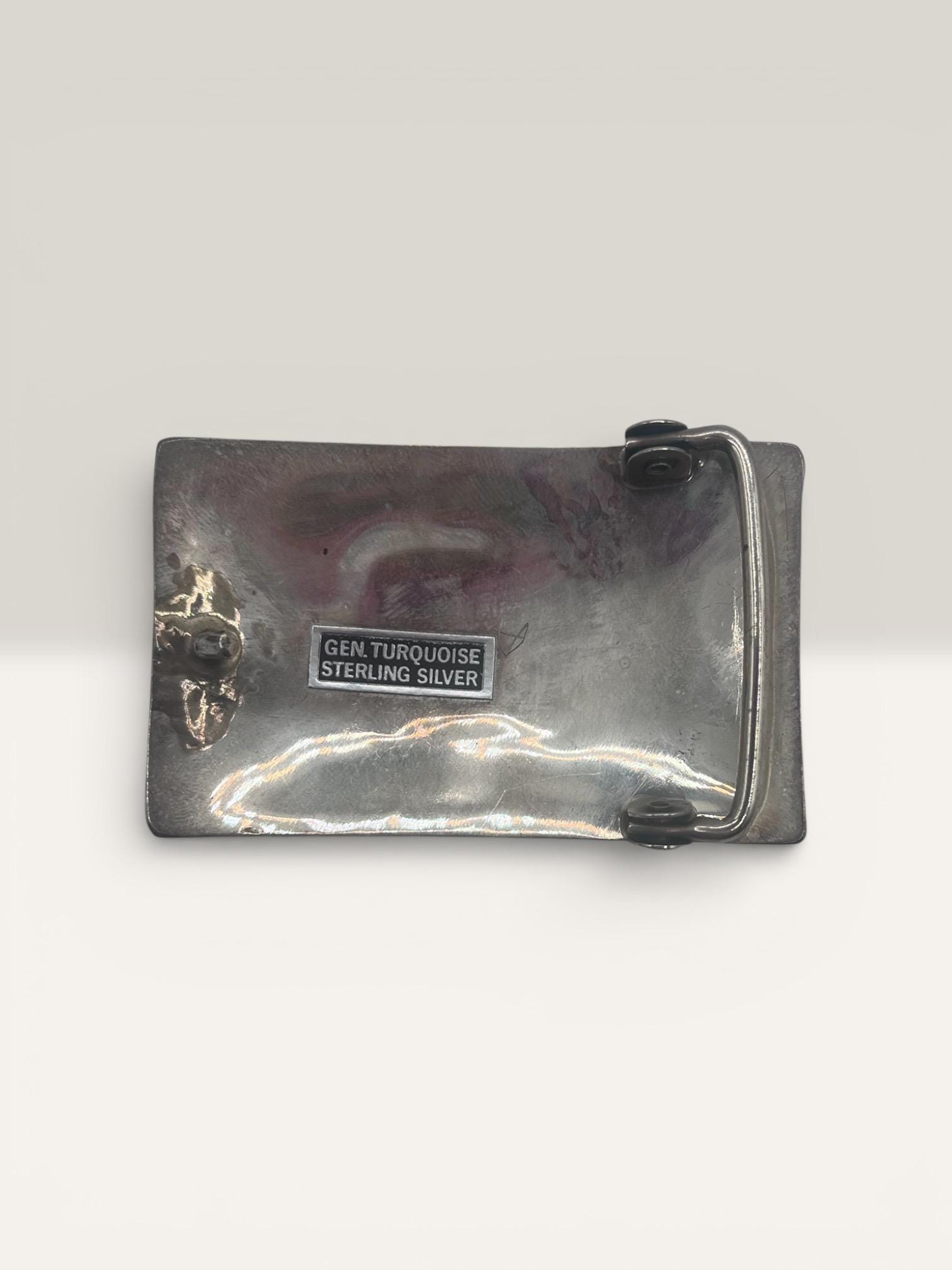 - Handmade sterling silver belt buckle with kingman green turquoise centerpiece