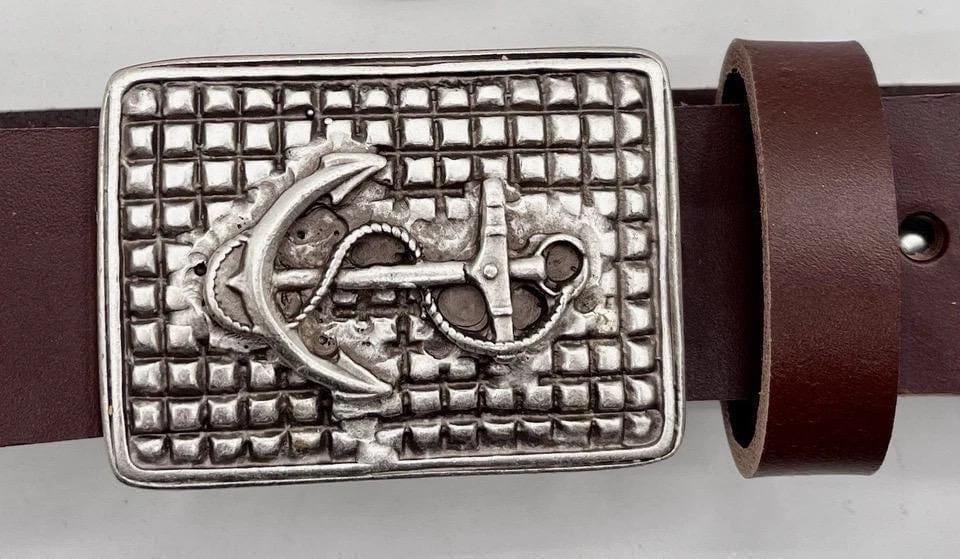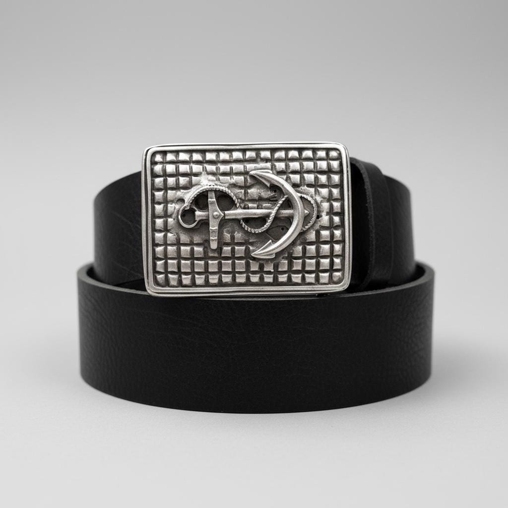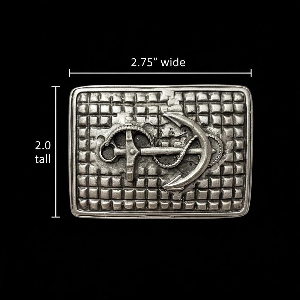 Make a bold nautical statement with this detailed anchor belt buckle paired with a custom-cut genuine leather belt. Featuring a sculpted anchor wrapped in rope against a textured grid background, this buckle blends rugged maritime character with timeless craftsmanship.
