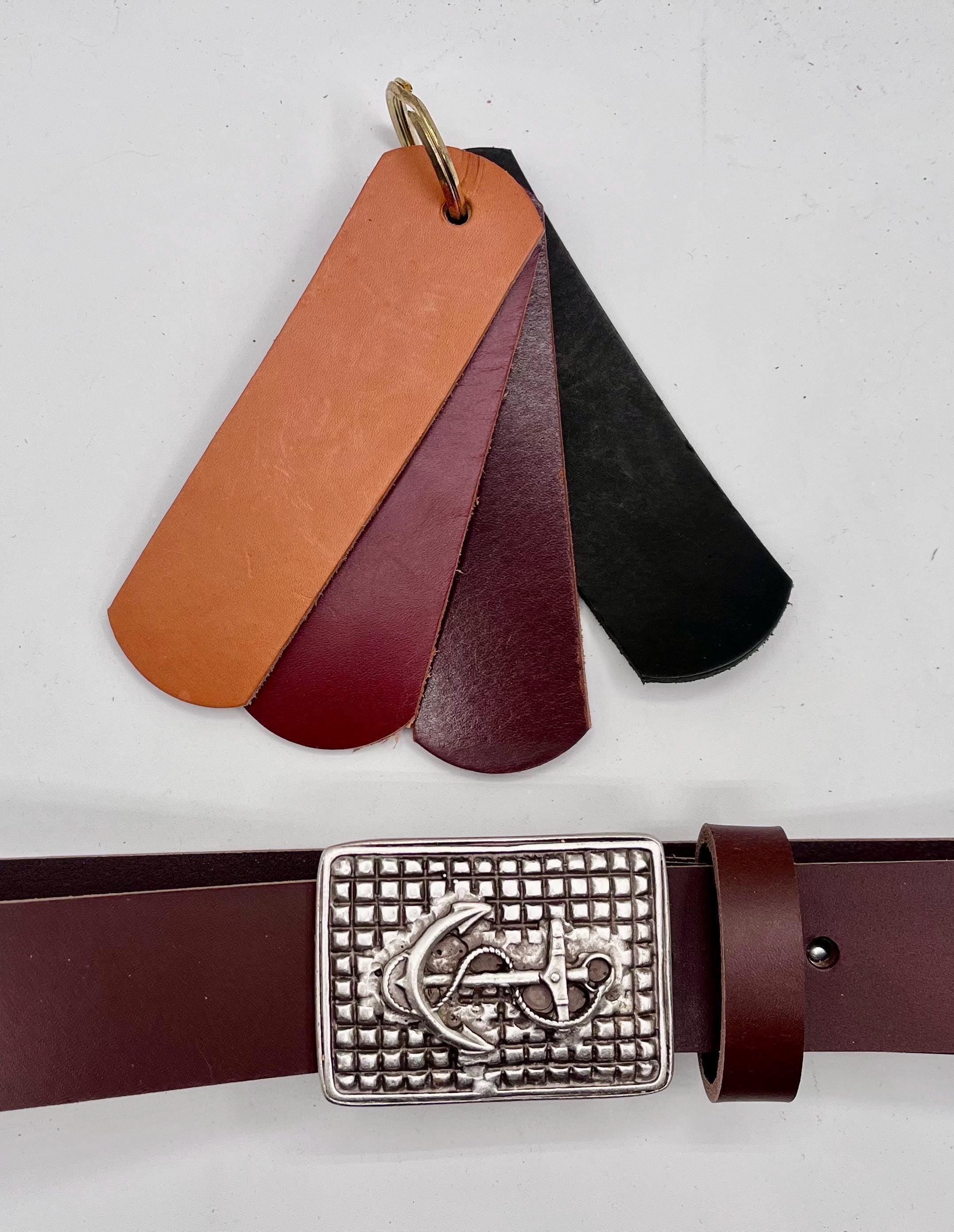 Measure your current belt from where the leather begins at the buckle to your most-used hole. Provide that measurement when ordering to ensure a perfect custom fit.