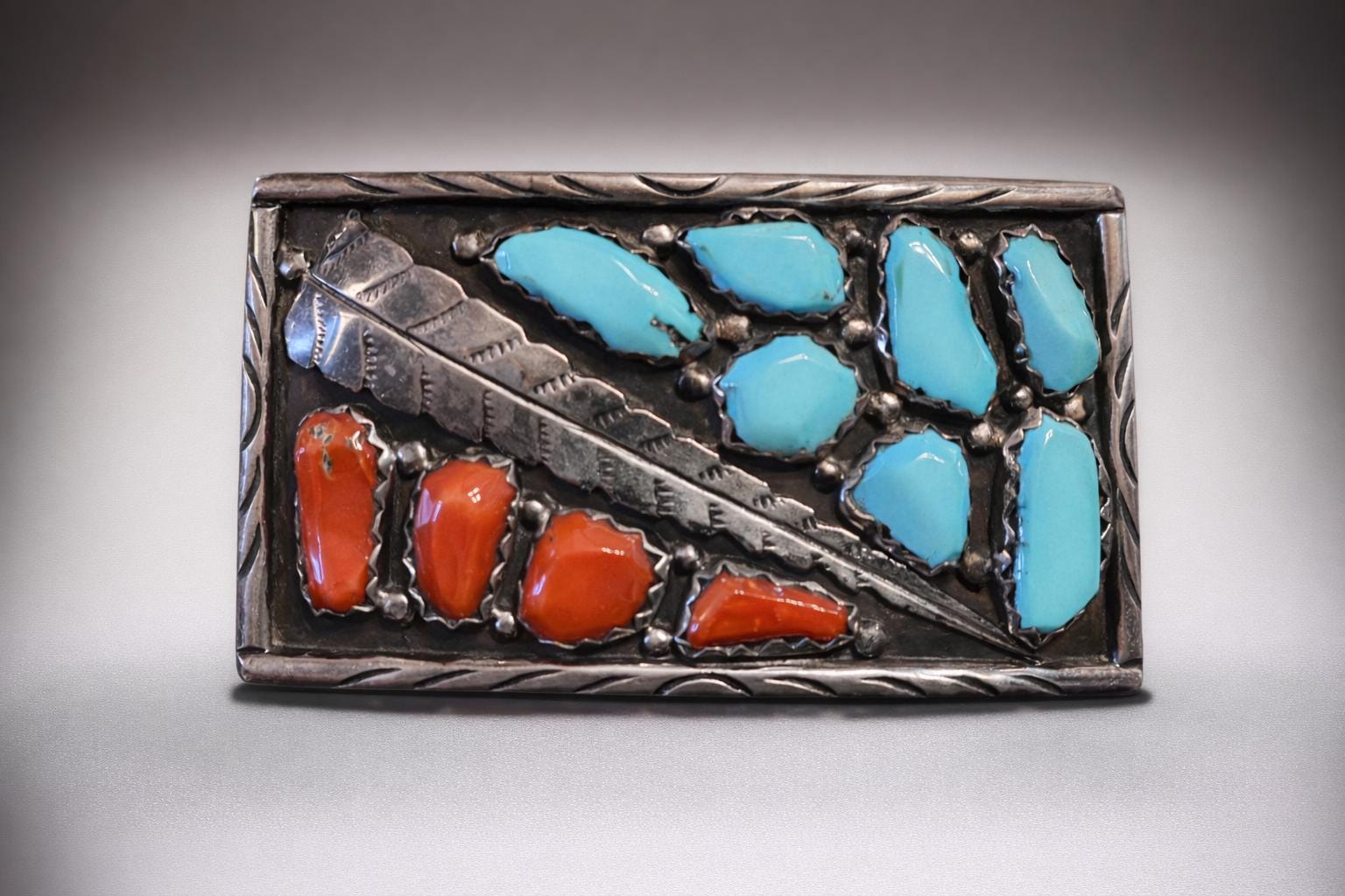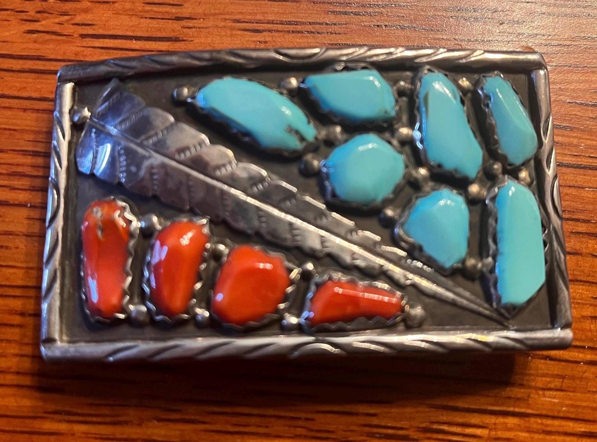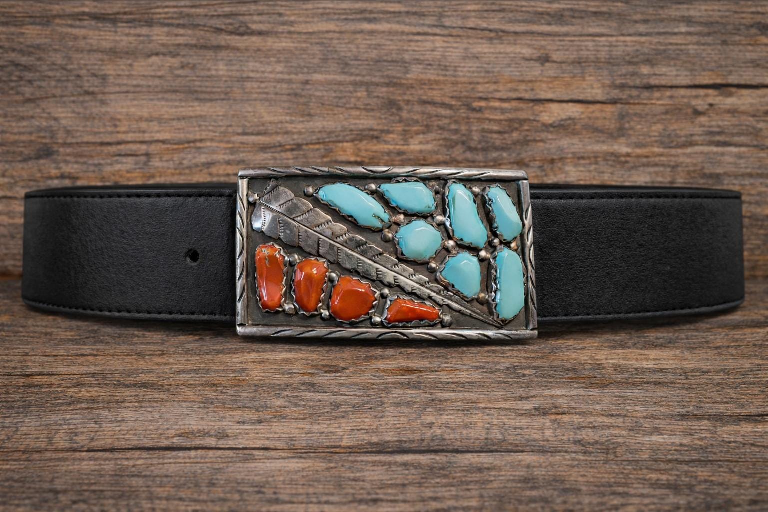 Vintage Southwestern Belt Buckle Genuine Feather Turquoise and Coral Turquoise Nuggets
