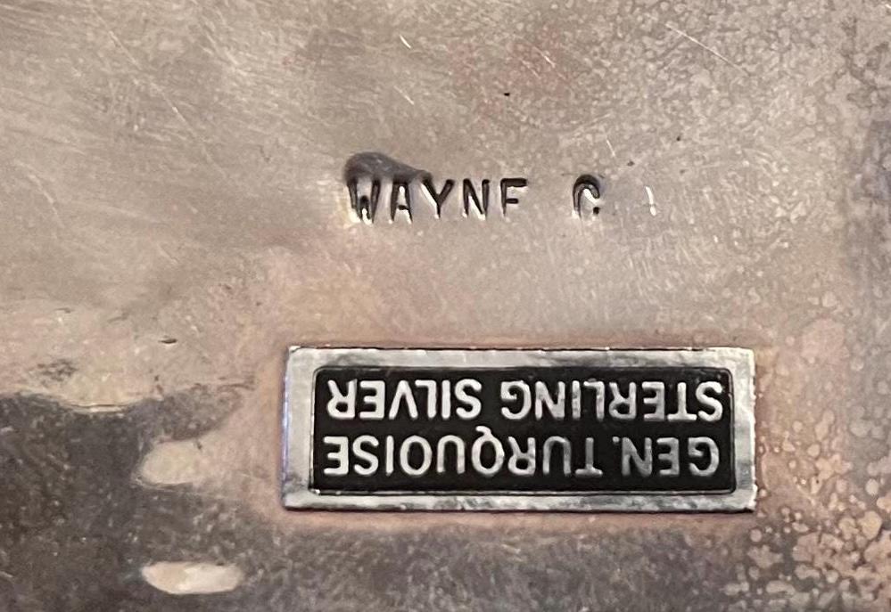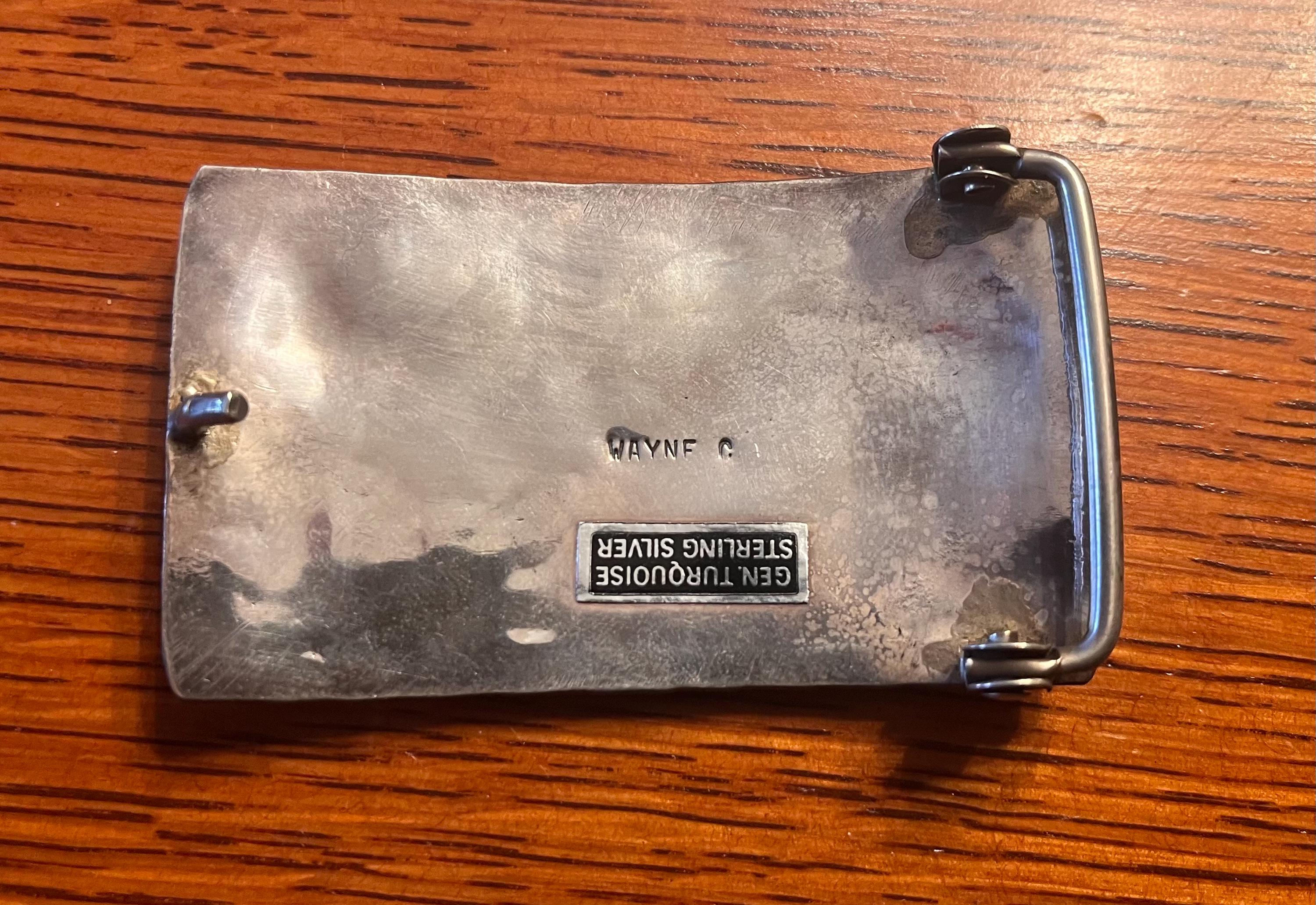 This buckle is signed Wayne C. While the hallmark and materials indicate authentic handmade sterling silver work, the specific tribal affiliation of the artist has not been definitively identified.