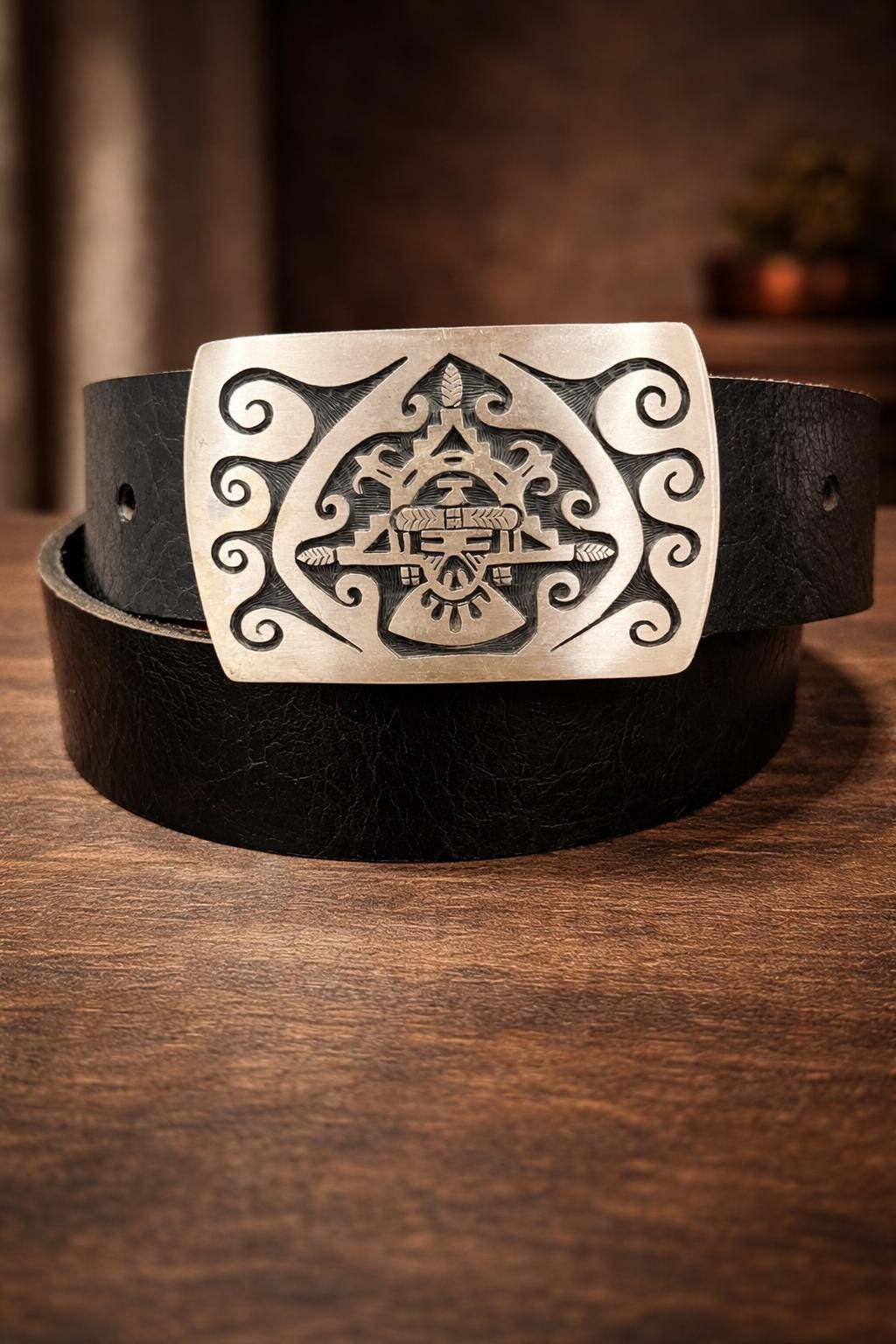 A striking, collector-quality sterling silver belt buckle featuring a bold Kachina face motif framed by flowing hand-engraved scrollwork.