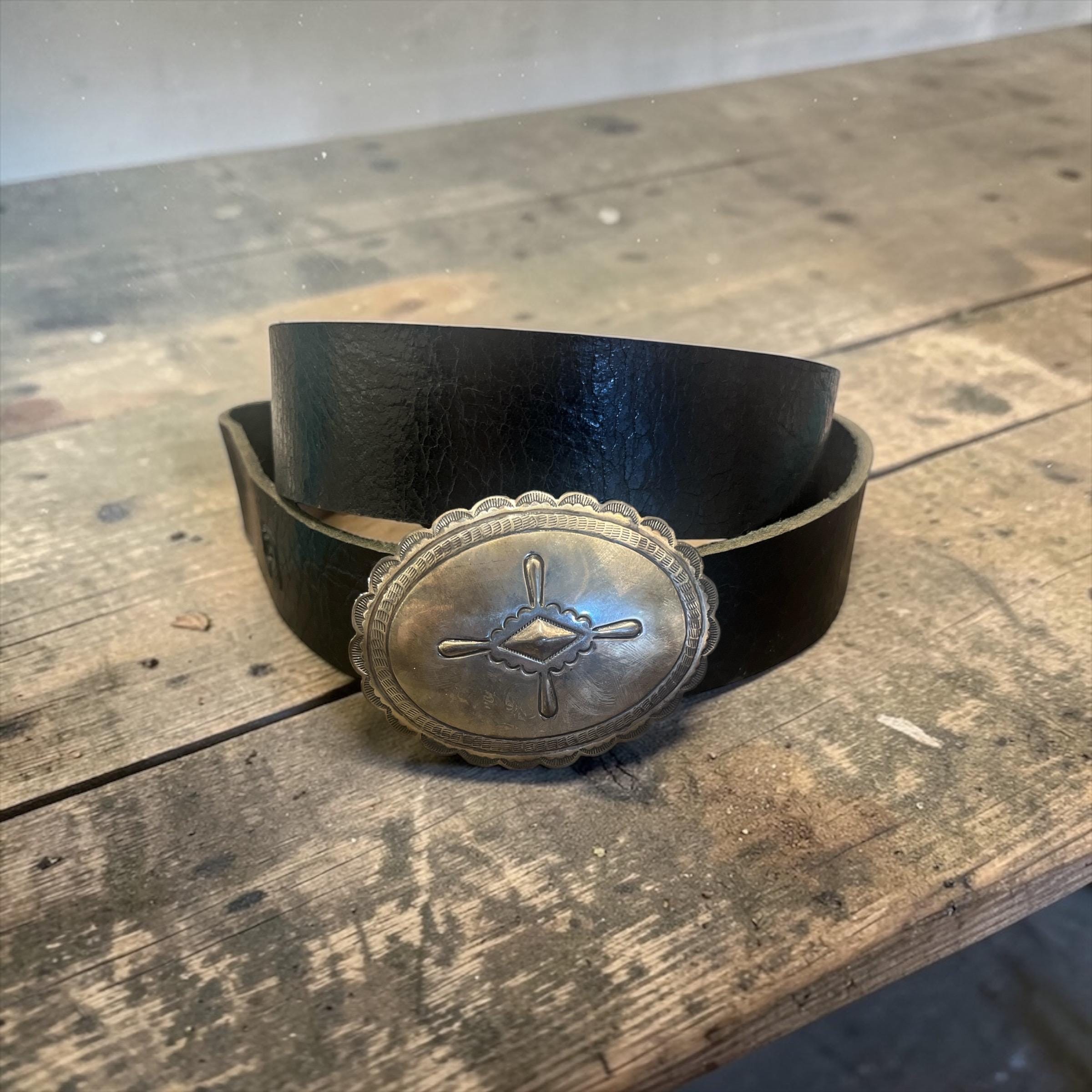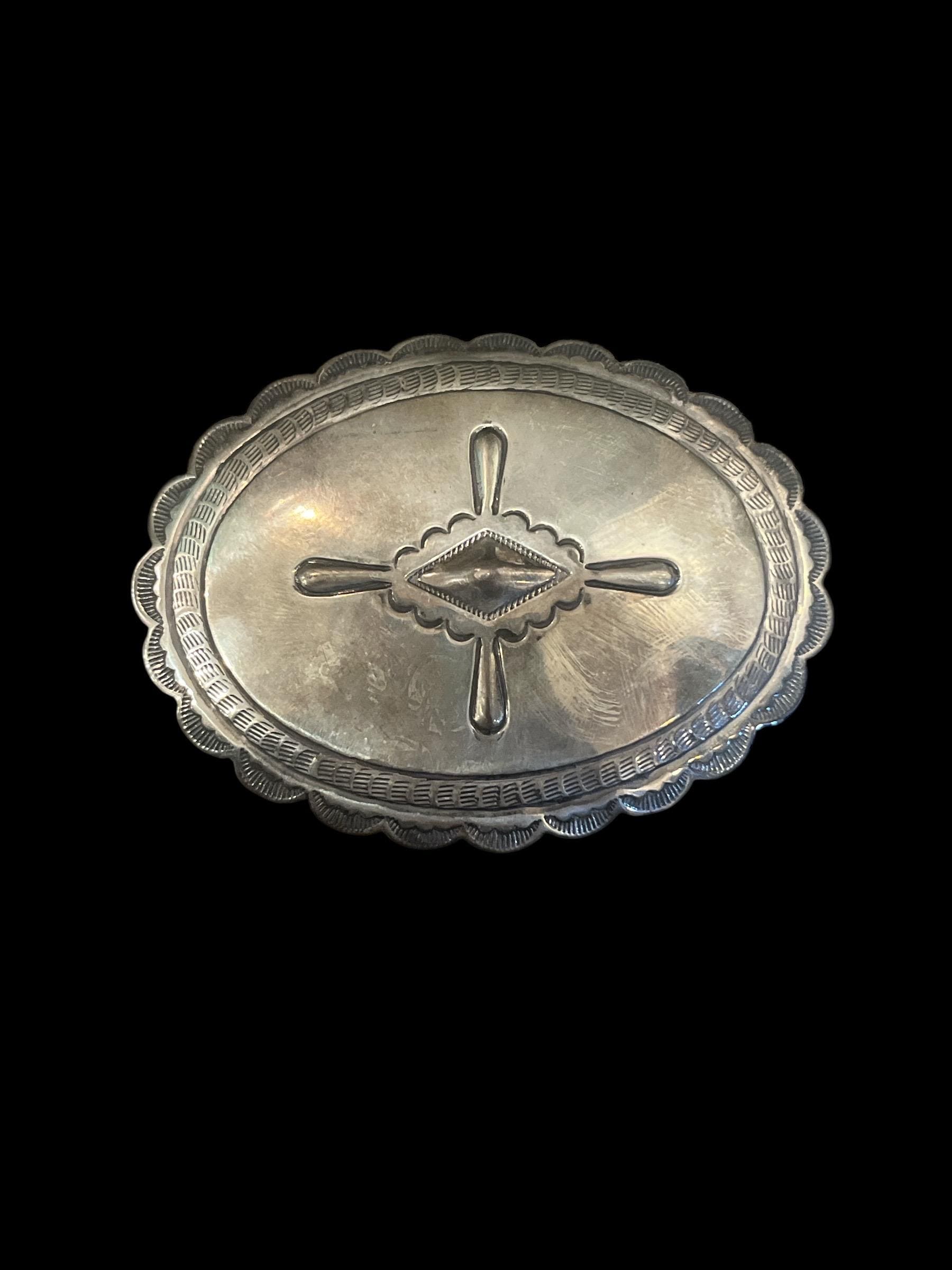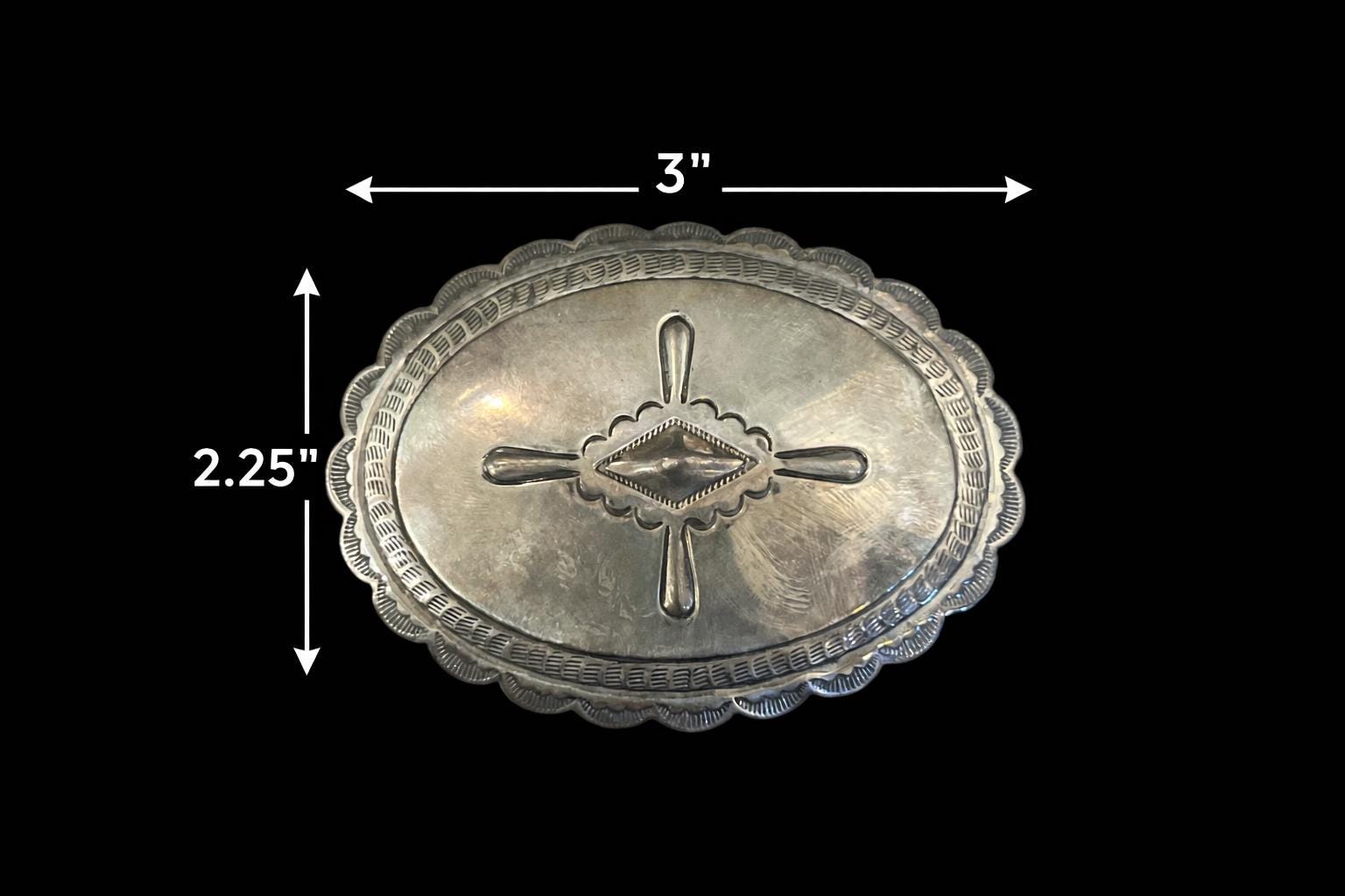 Beautiful Southwestern sterling silver concho-style belt buckle featuring a classic repousse crossburst design and scalloped border.