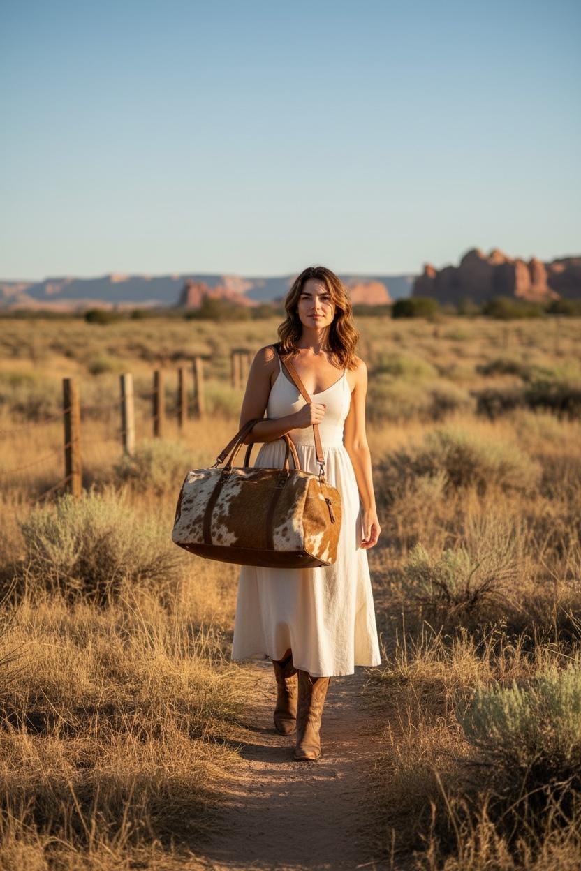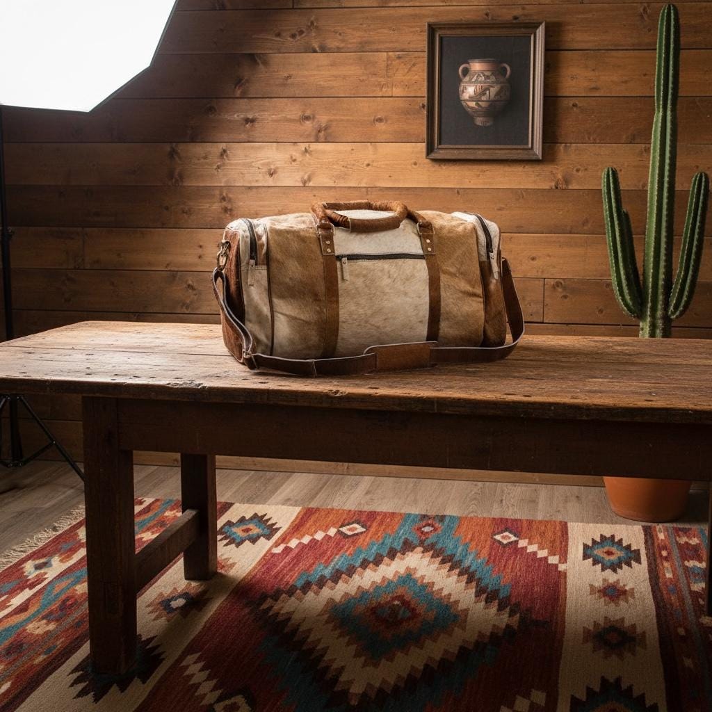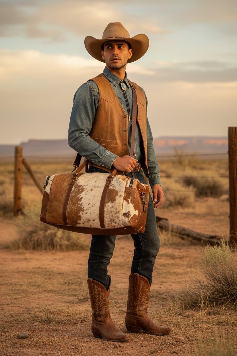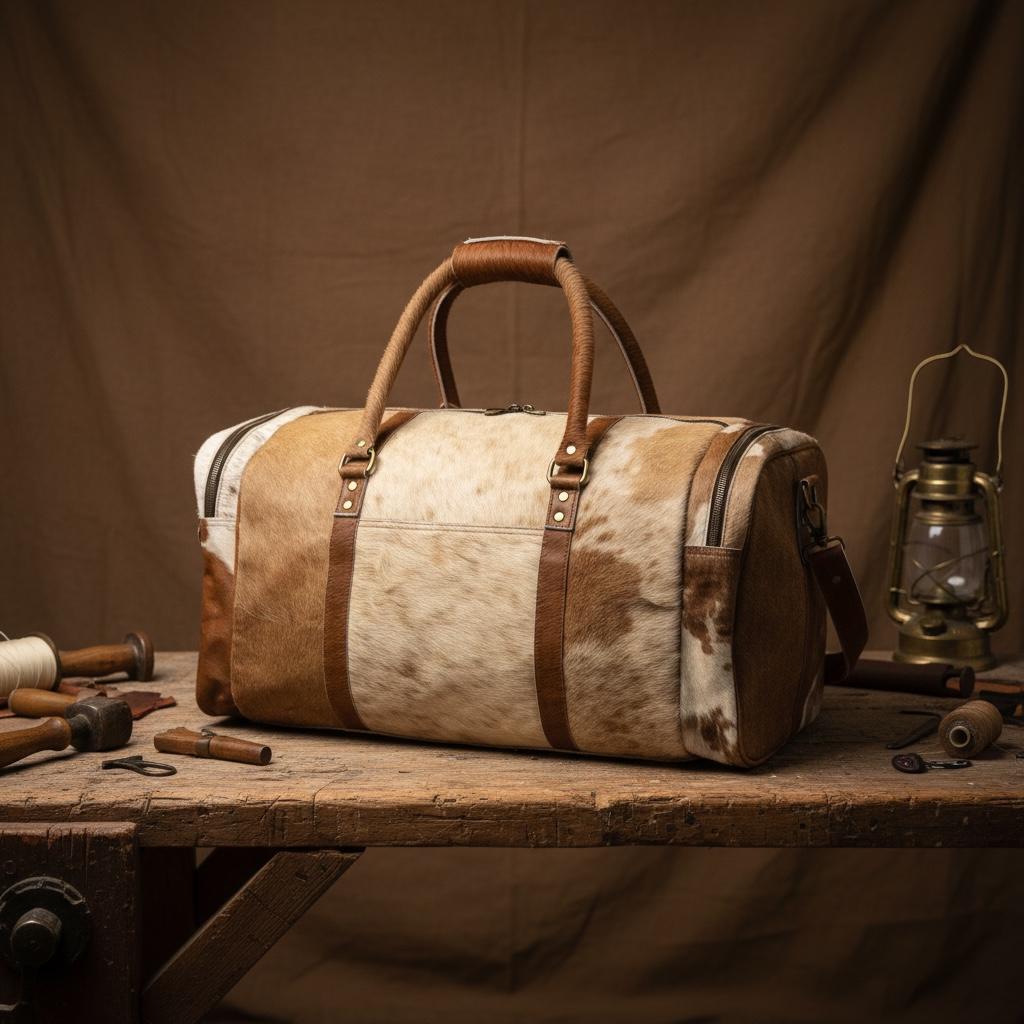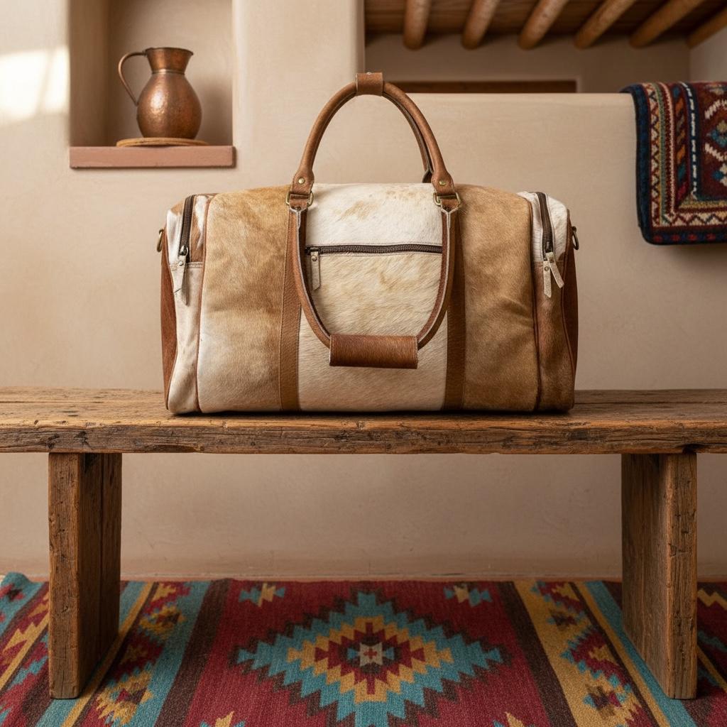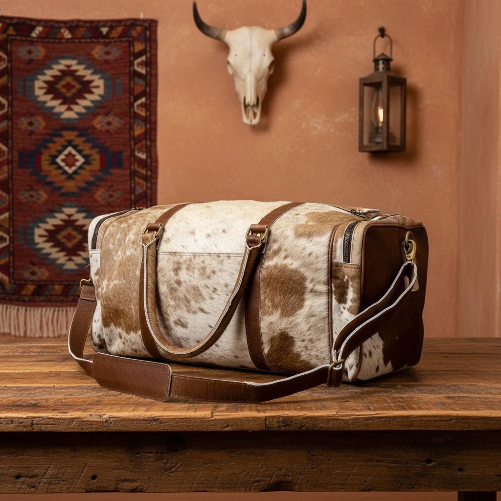 This large cowhide duffel combines western aesthetics with practical storage, making it perfect for weekend travel, gym use, overnight trips, or as a statement carry-on bag.