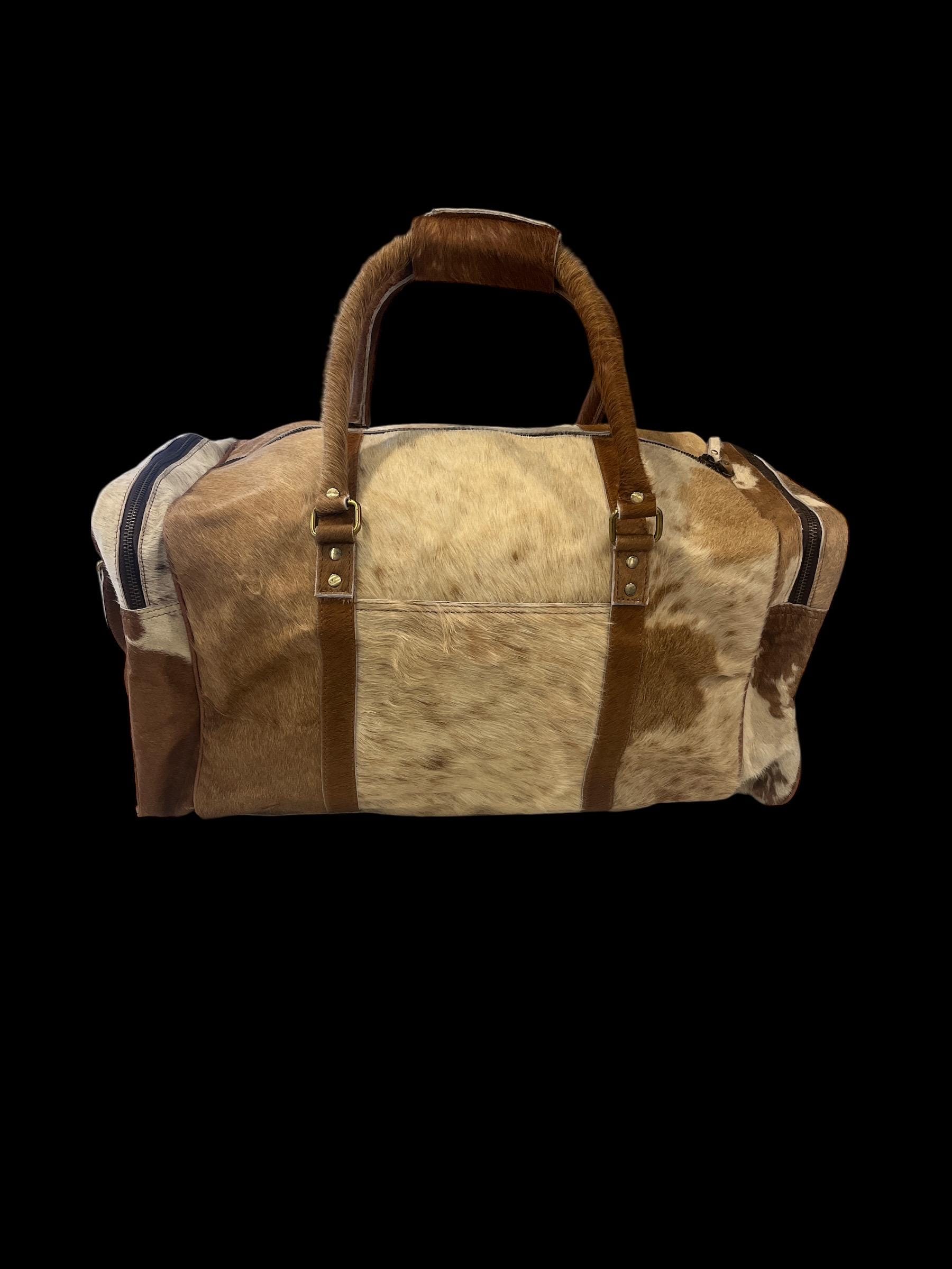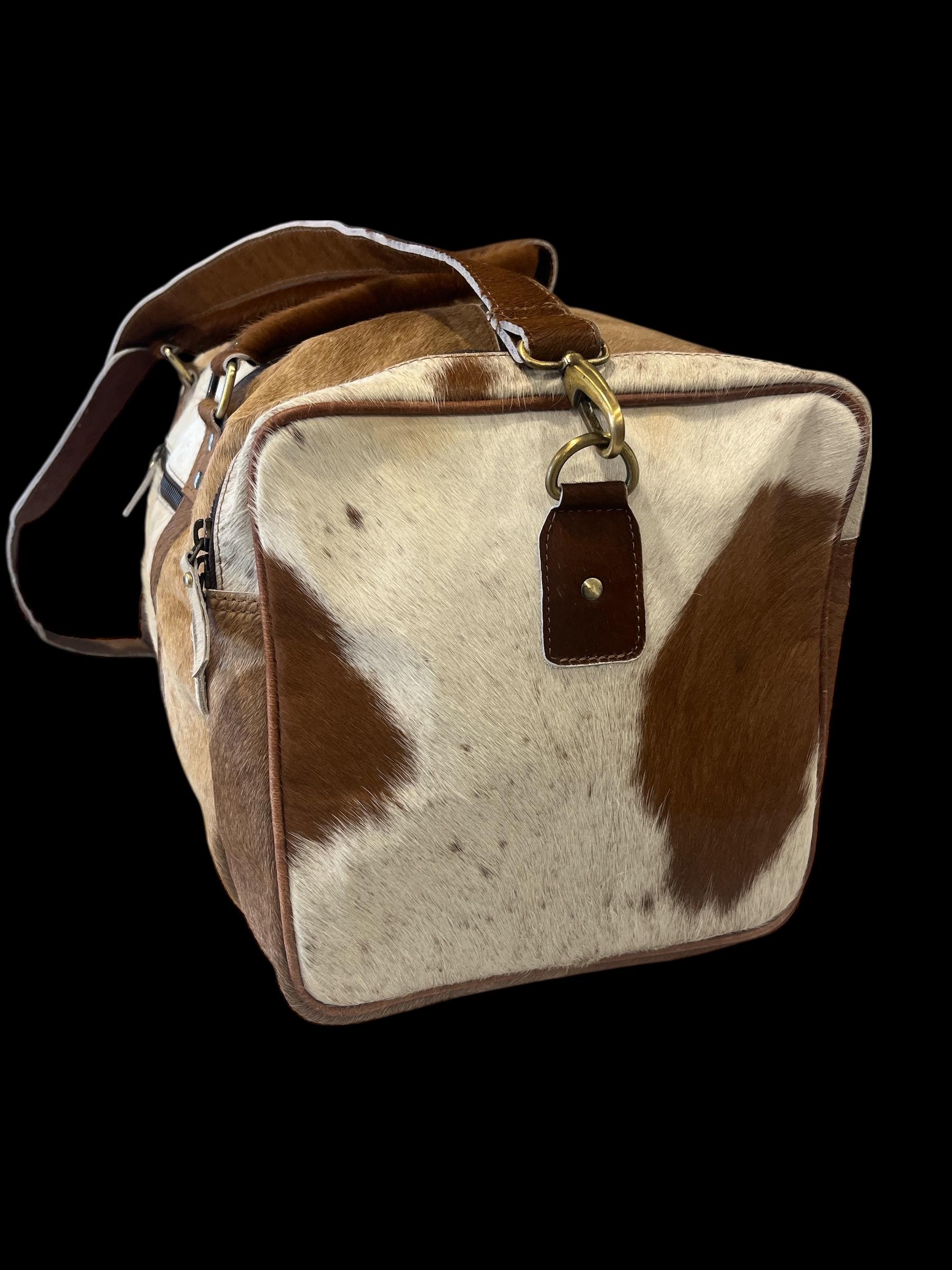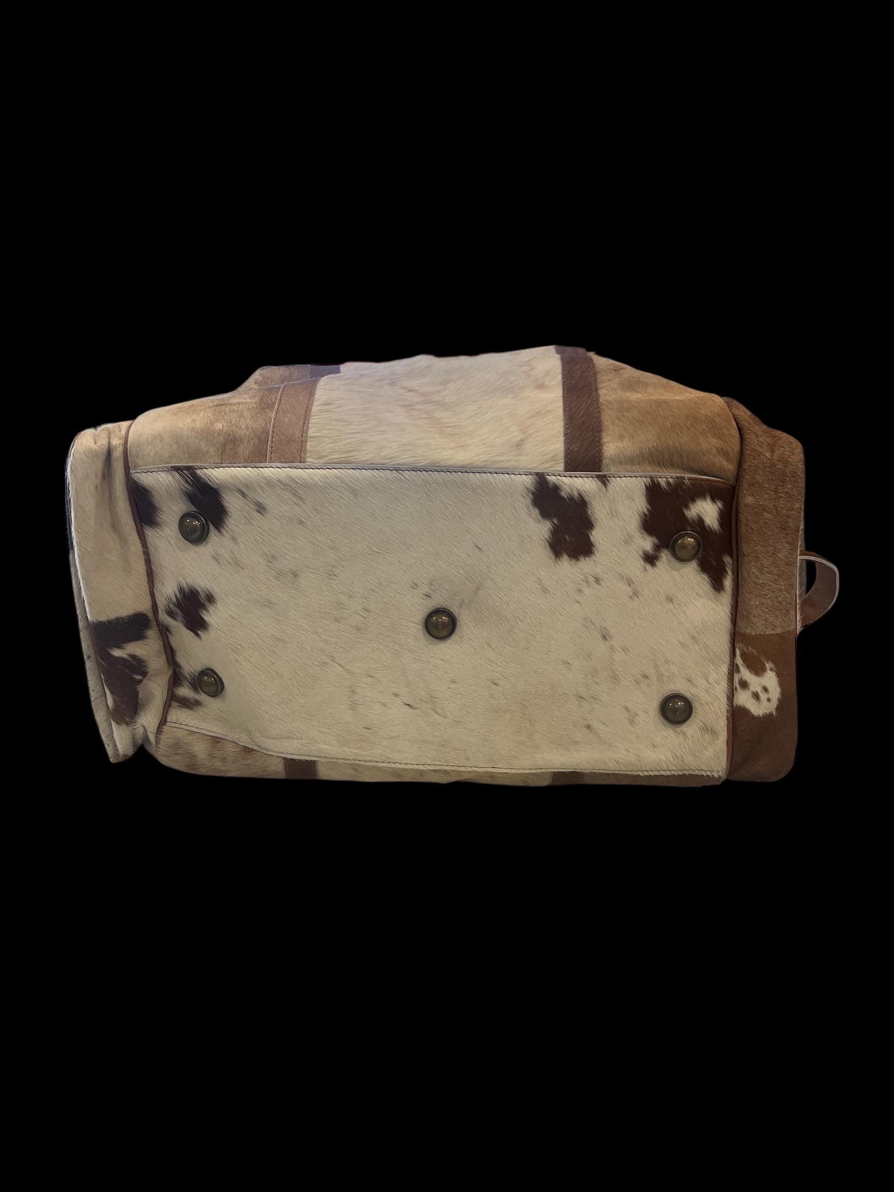 Travel in rugged Western style with this authentic hair-on cowhide duffle bag, designed for durability, functionality, and standout rustic character. Every bag features unique natural cowhide patterns, making each one completely one-of-a-kind.